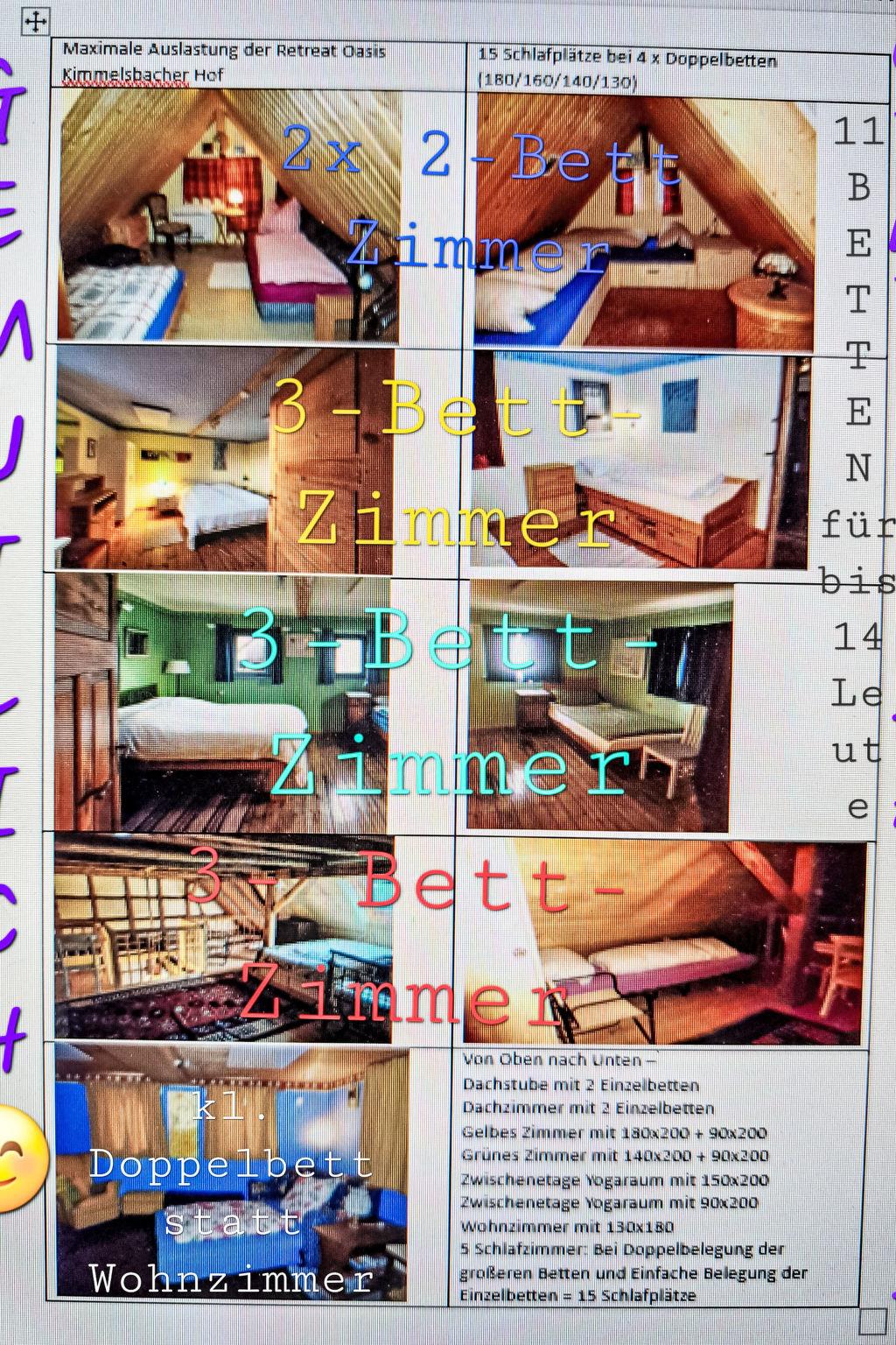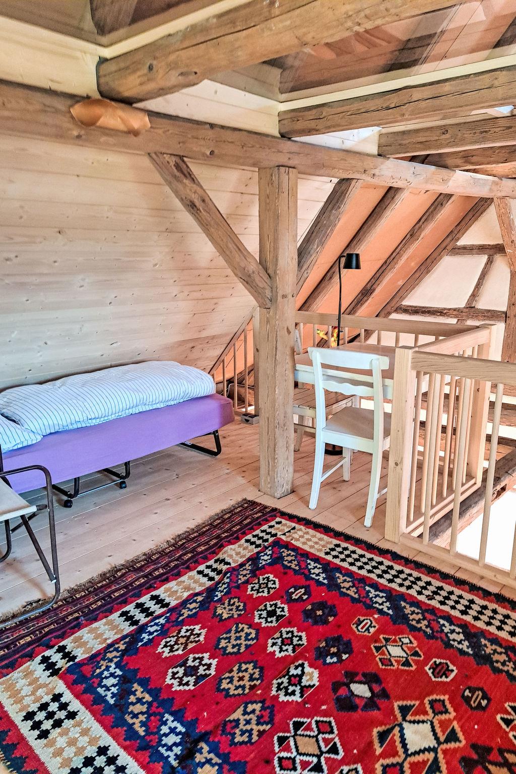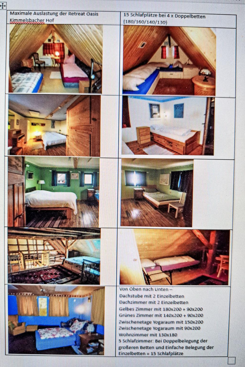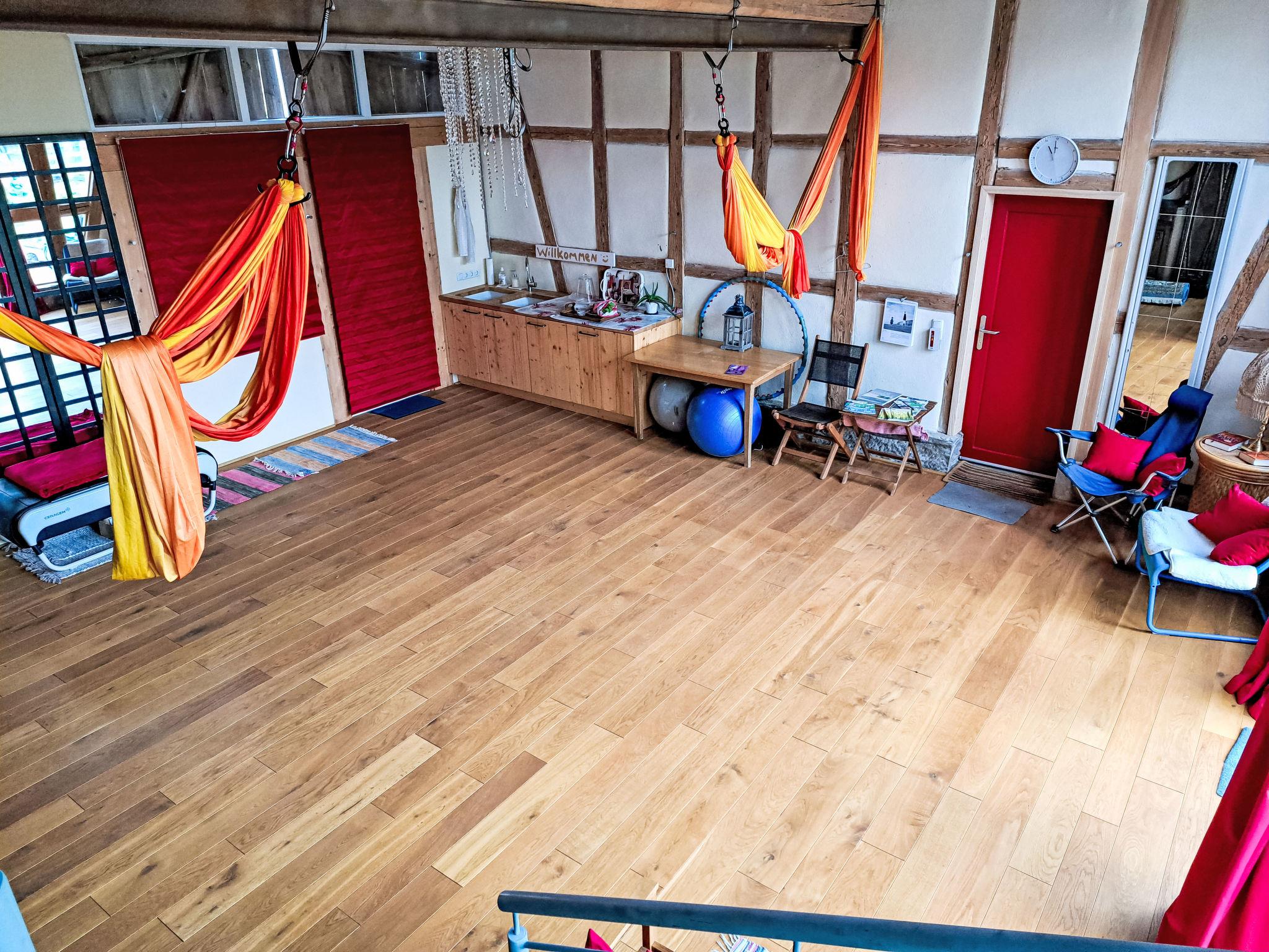 The former barn is the centrepiece of Kimmelsbacher Hof. As an Argentinian tango dancer and yoga enthusiast, the oak sprung floor fulfils my dream. In small groups of 5 to 6 people, the 48 square metre room is ideal for practising yoga, dancing or preparing a performance. The two areal yoga cloths can be tied up or used in your own practice. The Ceragem massage table has a healing effect on the whole body. Exercise balls, a hula hoop and other exercise accessories are available. You bring your own music and other equipment.