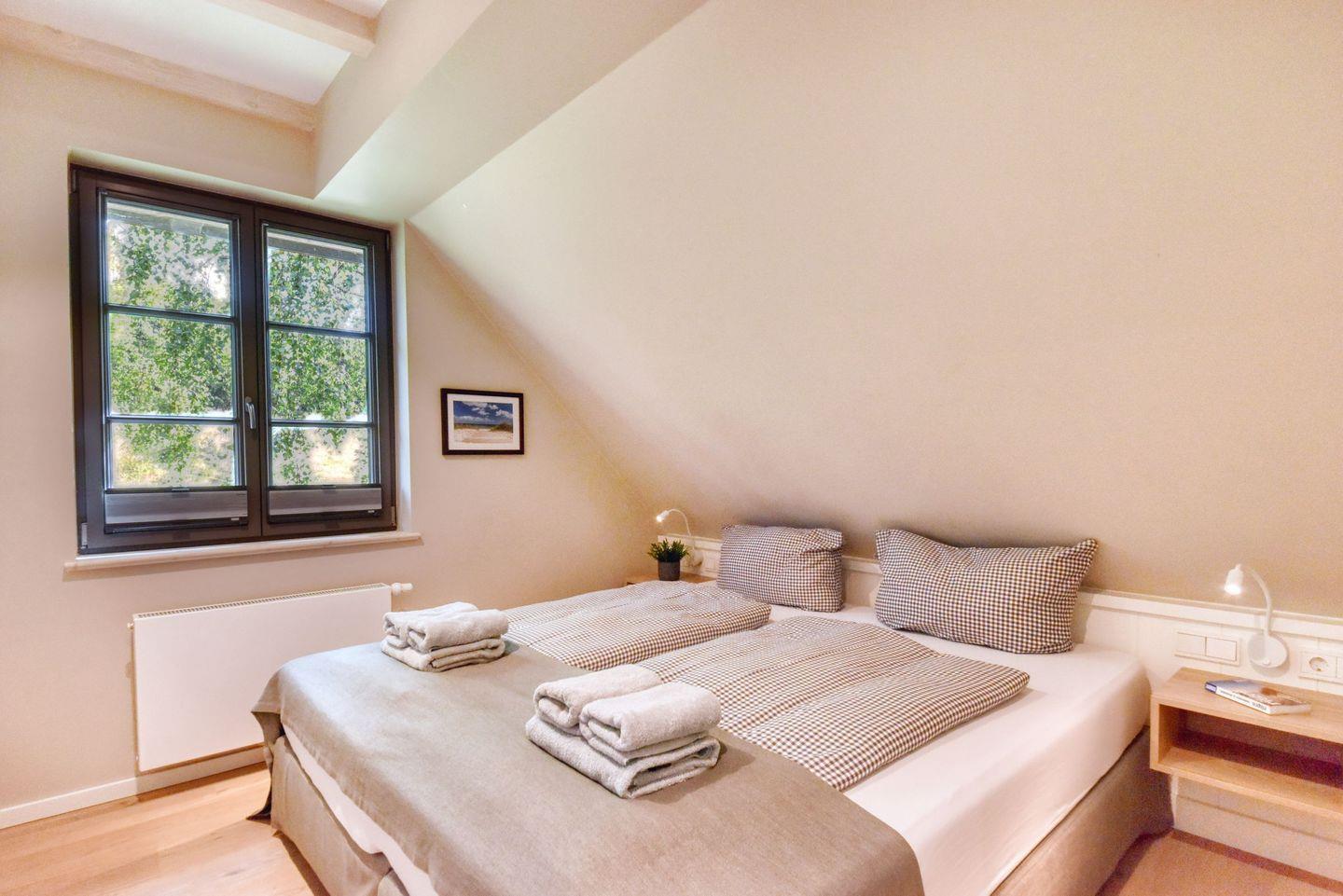 Zubereiten können Sie sie in der offenen und modernen Küche. Alle Geräte sind hochwertig. Ein komplettes Geschirr-Service befindet sich in den Schränken. Abwaschen muss hier zum Glück niemand. Es gibt einen Geschirrspüler. Weiter geht’s mit den beiden komfortablen Schlafzimmern. Ein bequemes Boxspringdoppelbett (180 x 200) und zwei Boxspringeinzelbetten (90 x 200) versprechen erholsame Träume. Die Zimmer verfügen über je einen Kleiderschrank und ebenfalls einen Flat-TV. Zwei Bäder mit Dusche und WC sorgen für genügend Raum zum Frischmachen. Das Bad im EG ist zudem mit einer Finnischen Sauna ausgestattet. Bei Anreise liegen Handtücher für Sie bereit und die Betten sind bezogen.