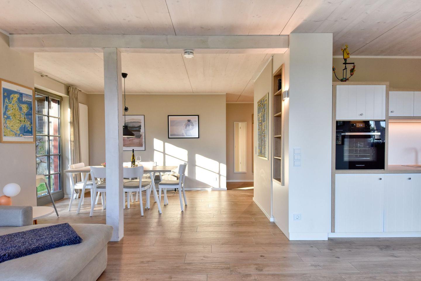 Im Feriendorf Klein Stresow werden Sie im „Seeblick-Ferienhaus Küstenhuus“ auf 115 Quadratmetern in Ihrer eigenen, stylischen Ferienhaushälfte mit Garten und direktem, unverbautem Meerblick von jedem Zimmer aus begrüßt. Hier beginnt der Urlaub für bis zu 6 Personen schon beim Eintreten. Wenn Sie es genau nehmen, schon beim Ankommen. Das Auto auf dem für Sie reservierten Stellplatz abgestellt, können Sie bei so viel sonniger Leichtigkeit erst einmal richtig durchatmen. Öffnen Sie die bodentiefen Fenster zu Ihrer Südterrasse weit und genießen Sie die frische Ostseebrise. Hier lässt es sich ausgezeichnet frühstücken. Das Innere Ihrer Ferienhaushälfte ist bis ins Detail aufs Feinste eingerichtet. Lampen, Möbel und Bilder sind nordisch nobel. Ein Sofa lädt zum Relaxen ein. Zur Ausstattung des Wohn-Esszimmers gehören ein Kamin und ein Flat-TV. Das WLAN können Sie kostenfrei nutzen. Ein schöner Esstisch mit sechs Stühlen eignet sich bestens für die Mahlzeiten.