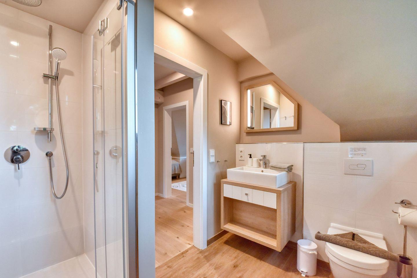 Zubereiten können Sie sie in der offenen und modernen Küche. Alle Geräte sind hochwertig. Ein komplettes Geschirr-Service befindet sich in den Schränken. Abwaschen muss hier zum Glück niemand. Es gibt einen Geschirrspüler. Weiter geht’s mit den beiden komfortablen Schlafzimmern. Zwei bequeme Boxspringdoppelbett (180 x 200) und zwei Boxspringeinzelbetten (90 x 200) versprechen erholsame Träume. Die Zimmer verfügen über je einen Kleiderschrank und ebenfalls einen Flat-TV. Zwei Bäder mit Dusche und WC sorgen für genügend Raum zum Frischmachen. Das Bad im EG ist zudem mit einer Finnischen Sauna ausgestattet. Bei Anreise liegen Handtücher für Sie bereit und die Betten sind bezogen.