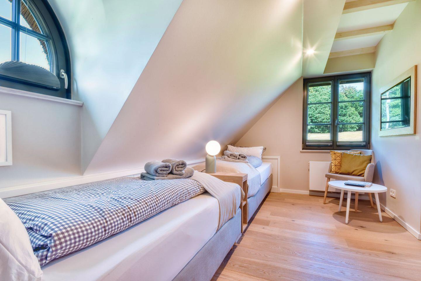Zubereiten können Sie sie in der offenen und modernen Küche. Alle Geräte sind hochwertig. Ein komplettes Geschirr-Service befindet sich in den Schränken. Abwaschen muss hier zum Glück niemand. Es gibt einen Geschirrspüler. Weiter geht’s mit den beiden komfortablen Schlafzimmern. Ein bequemes Boxspringdoppelbett (180 x 200) und zwei Boxspringeinzelbetten (90 x 200) versprechen erholsame Träume. Die Zimmer verfügen über je einen Kleiderschrank und ebenfalls einen Flat-TV. Zwei Bäder mit Dusche und WC sorgen für genügend Raum zum Frischmachen. Das Bad im EG ist zudem mit einer Finnischen Sauna ausgestattet. Bei Anreise liegen Handtücher für Sie bereit und die Betten sind bezogen.
