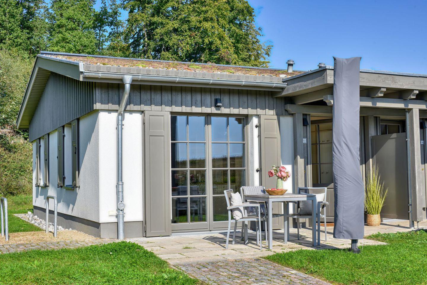 Im Feriendorf Klein Stresow werden Sie auf 41 Quadratmeter in Ihrer eigenen, stylischen Ferienhaushälfte mit Garten und Weitblick begrüßt . Hier beginnt der Urlaub für bis zu 2 Personen schon beim Eintreten. Wenn Sie es genau nehmen, schon beim Ankommen. Das Auto auf dem für Sie reservierten Stellplatz abgestellt, können Sie bei so viel sonniger Leichtigkeit erst einmal richtig durchatmen. Öffnen Sie die bodentiefen Fenster zu Ihrer Süd-Westterrasse und genießen Sie die frische Ostseebrise. Hier lässt es sich ausgezeichnet frühstücken. Das Innere Ihrer Ferienhaushälfte ist bis ins Detail aufs Feinste eingerichtet. Lampen, Möbel und Bilder sind nordisch nobel. Ein Sofa lädt zum Relaxen ein. Zur Ausstattung des Wohn-Esszimmers gehört ein Flat-TV. Das WLAN können Sie kostenfrei nutzen. Ein schöner Esstisch mit vier Stühlen eignet sich bestens für die Mahlzeiten.