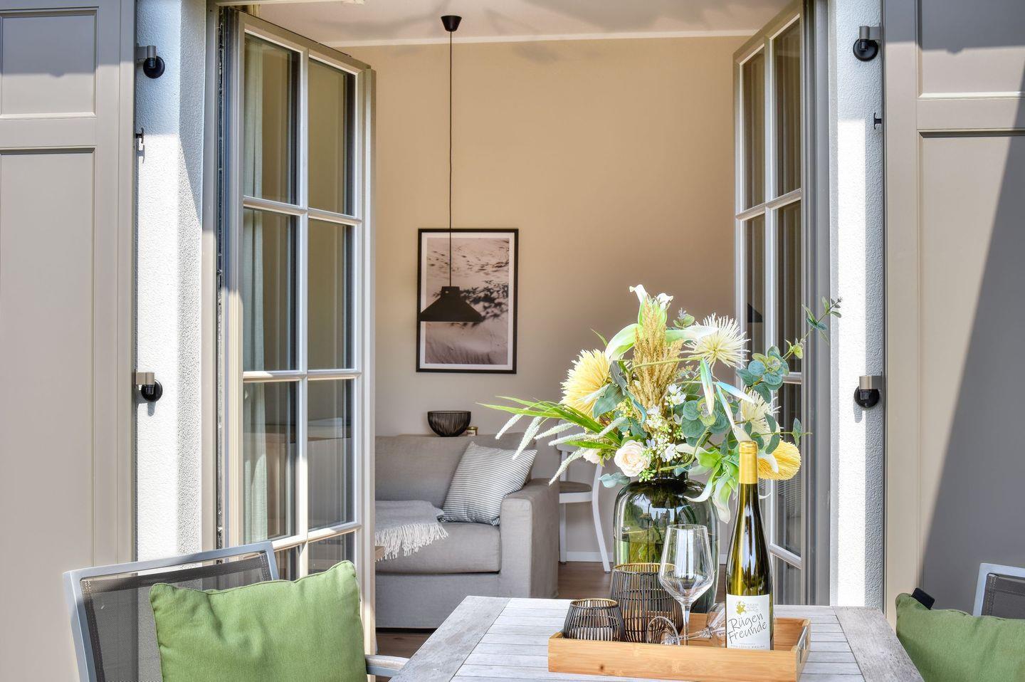Im Feriendorf Klein Stresow werden Sie auf 53 Quadratmeter in Ihrer eigenen, stylischen Ferienhaushälfte mit Garten und Weitblick begrüßt . Hier beginnt der Urlaub für bis zu 2 Personen schon beim Eintreten. Wenn Sie es genau nehmen, schon beim Ankommen. Das Auto auf dem für Sie reservierten Stellplatz abgestellt, können Sie bei so viel sonniger Leichtigkeit erst einmal richtig durchatmen. Öffnen Sie die bodentiefen Fenster zu Ihrer Süd-Westterrasse weit und genießen Sie die frische Ostseebrise. Hier lässt es sich ausgezeichnet frühstücken. Das Innere Ihrer Ferienhaushälfte ist bis ins Detail aufs Feinste eingerichtet. Lampen, Möbel und Bilder sind nordisch nobel. Ein Sofa lädt zum Relaxen ein. Zur Ausstattung des Wohn-Esszimmers gehört ein Flat-TV. Das WLAN können Sie kostenfrei nutzen. Ein schöner Esstisch mit zwei Stühlen eignet sich bestens für die Mahlzeiten.