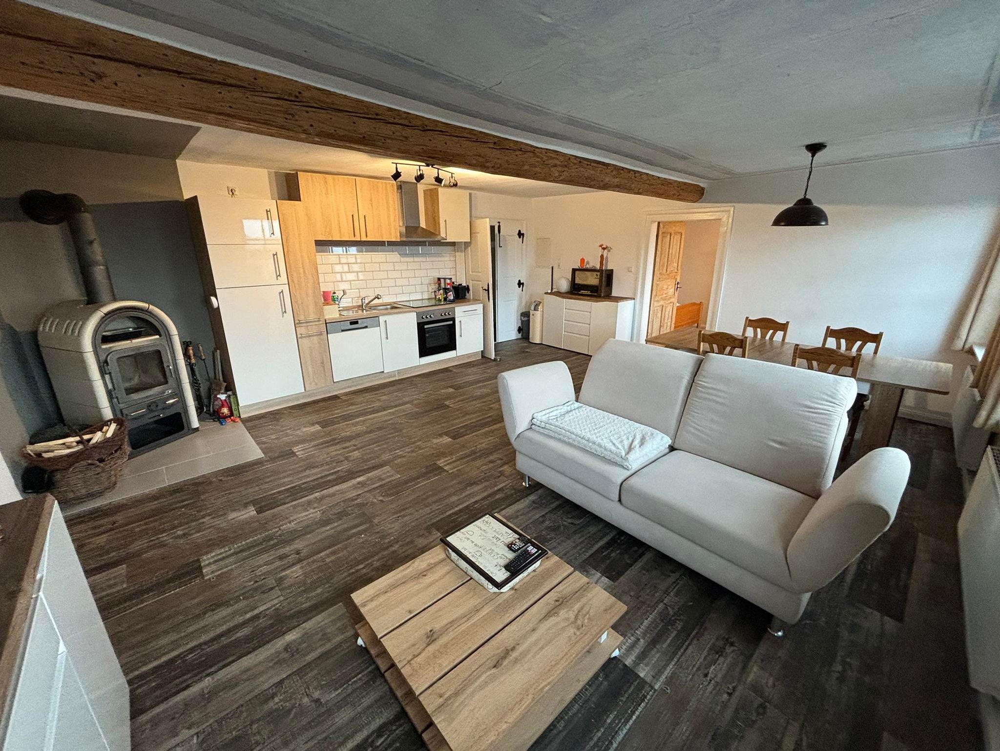Großes Wohnzimmer mit Küche, Esstisch und Kaminofen, Schlafzimmer mit Doppel- und Einzelbett. Perfekte Ausgangslage für Wanderer, Mountainbike- und Motorradfahrer.