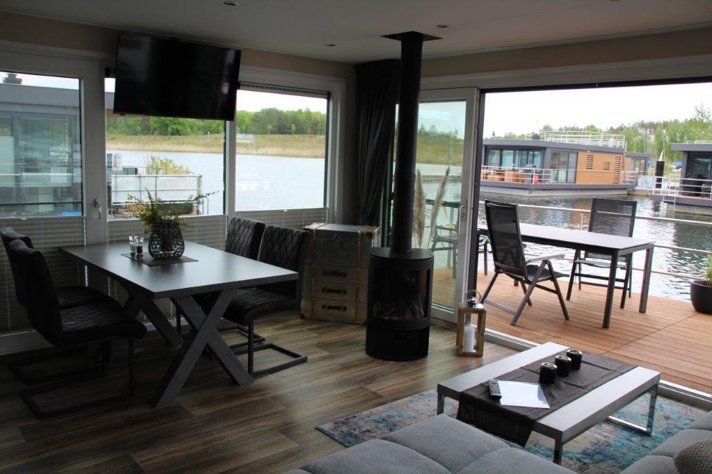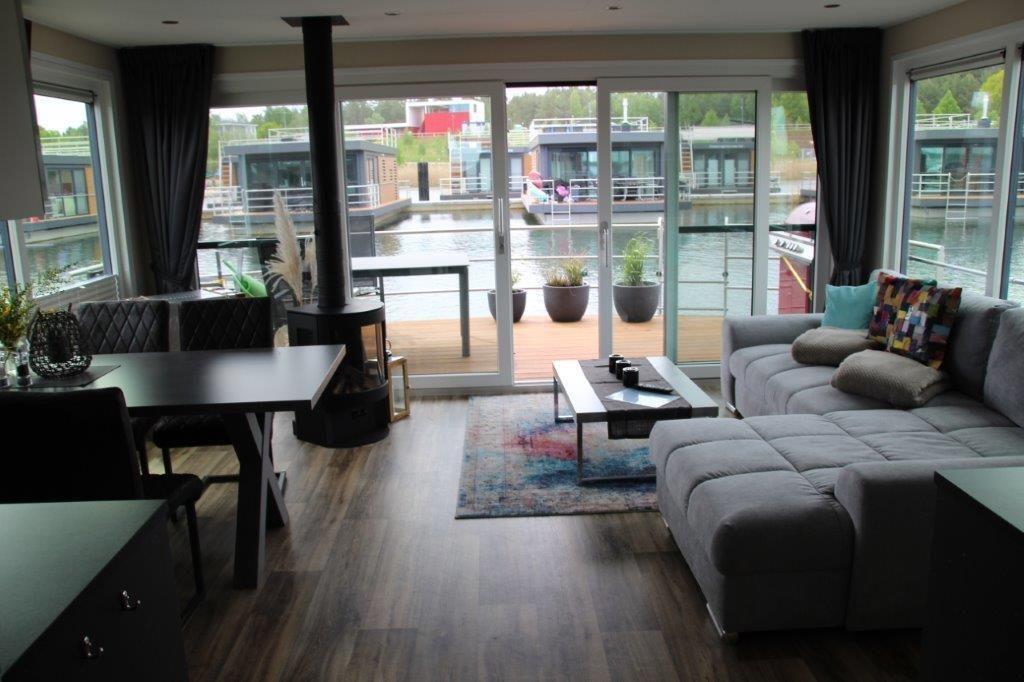 Floatinghouse Seensucht: freistehendes Hausboot auf dem Wasser mit Seeblick und Landschaftsblick. 44 m², 3 Zimmer, 2 Schlafzimmer, 1 Bad, für bis zu 5 Personen, Nichtraucher und kinderfreundlich. Offene Küche zum Wohnzimmer mit Ceranherd, Spülmaschine und Elektrogrill. Überdachte Terrasse mit Gartenmöbeln, Sonnenliegen, Steg, WLAN/TV, Klimaanlage und Gaskamin.