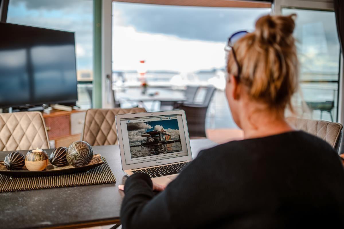 Floatinghouse Skyline: freistehendes Hausboot direkt auf dem Wasser mit Seeblick und Landschaftsblick. 44 m², 3 Zimmer, 2 Schlafzimmer und 1 Bad für bis zu 4 Personen, kinderfreundlich und Nichtraucher. Offene Küche zum Wohnzimmer mit Ceranherd, Spülmaschine und Kaffeemaschine. Klimaanlage, WLAN/TV/Radio sowie überdachte Terrasse mit Gartenmöbeln und Sonnenliegen.