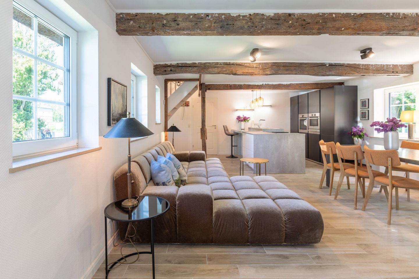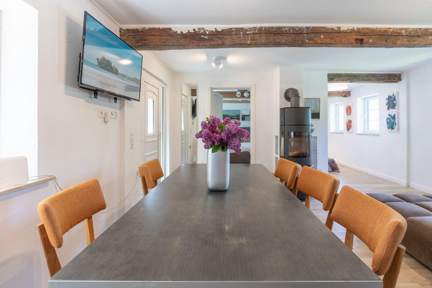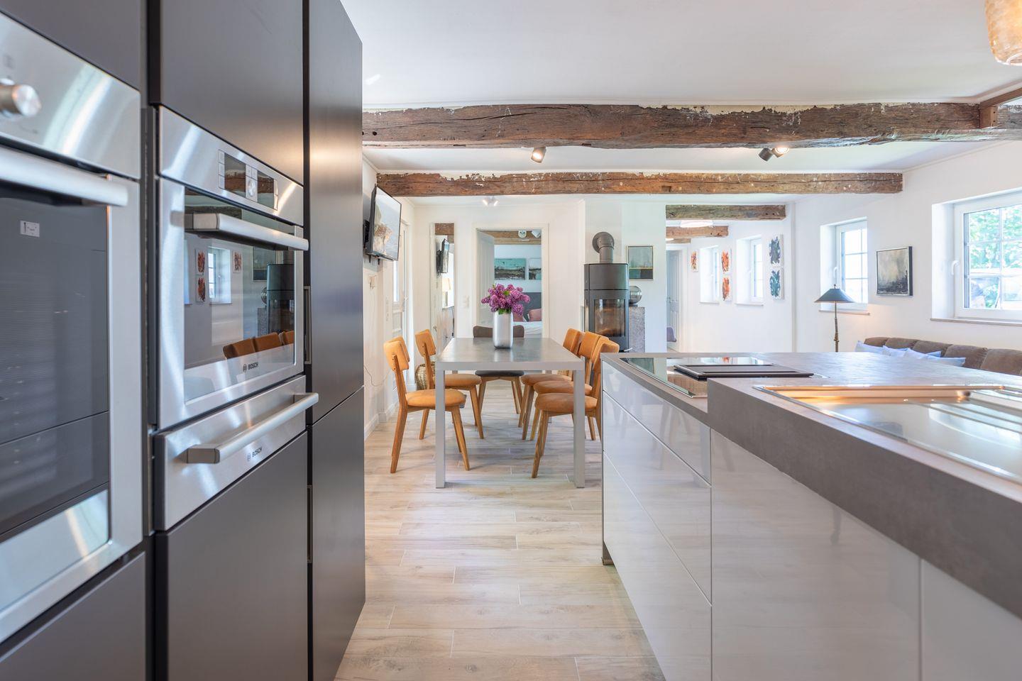 Die offene, gut ausgestattete Küche lädt Hobbyköche zum Kochen ein: Sie finden hier einen Kühlschrank mit Gefrierfach, einen Backofen, einen Induktionsherd, eine Kaffeemaschine (Filtergröße 4), einen Wasserkocher, eine Mikrowelle, einen Toaster und einen Geschirrspüler. Die gemütliche Sitzecke bietet Platz für gesellige Runden. Der Wohnbereich mit einer bequemen Sofalandschaft ist ideal für kuschelige Kaminabende oder spannende Filmabende vor dem großen Flachbildschirm-TV. Das Badezimmer im Erdgeschoss bietet neben einer Dusche auch eine Badewanne für entspannende Momente. Im Hauswirtschaftsraum stehen Ihnen eine Waschmaschine und ein Trockner zur Verfügung. Die geschützte Terrasse lädt zum Ausklingen des Tages ein.