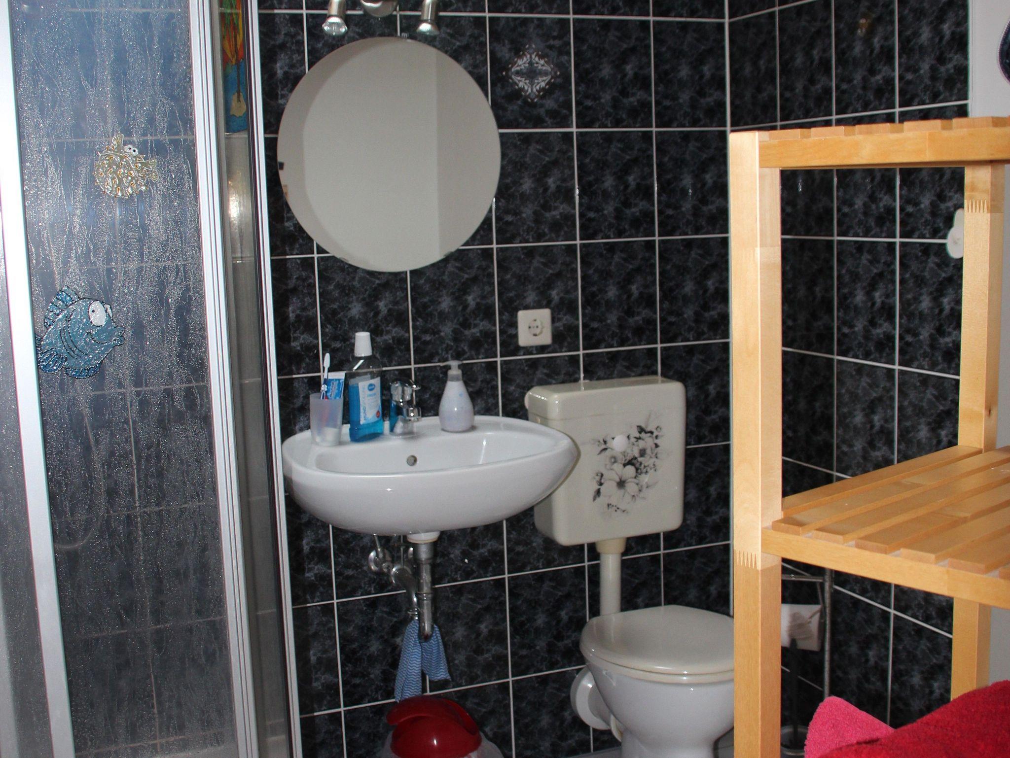 Die kleine Küche verfügt über eine Mikrowelle, einen kleinen Kochherd, eine Kaffeemaschine, einen Wasserkocher, sowie über Geschirr. Ein Bad mit Dusche und WC.