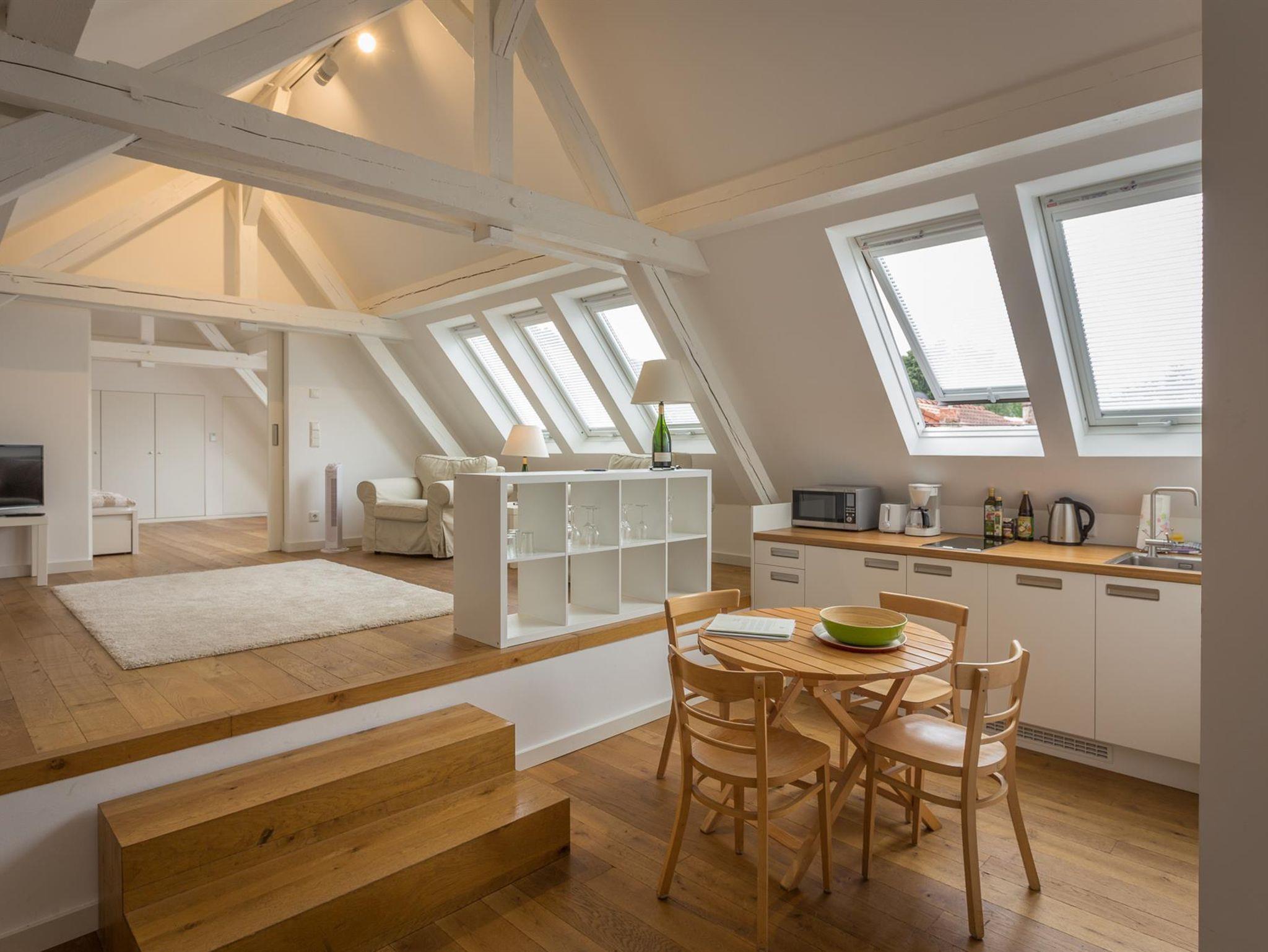 Die Ferienwohnung Blanc et Noir befindet sich in der Remise, OG und verfügt über einen großzügigen Wohn-Ess-Kochbereich mit Einbauküche inkl. Geschirrspülmaschine, lichtdurchflutetes Schlafzimmer, zweites Schlafzimmer mit Einzelbetten, modernes Bad.