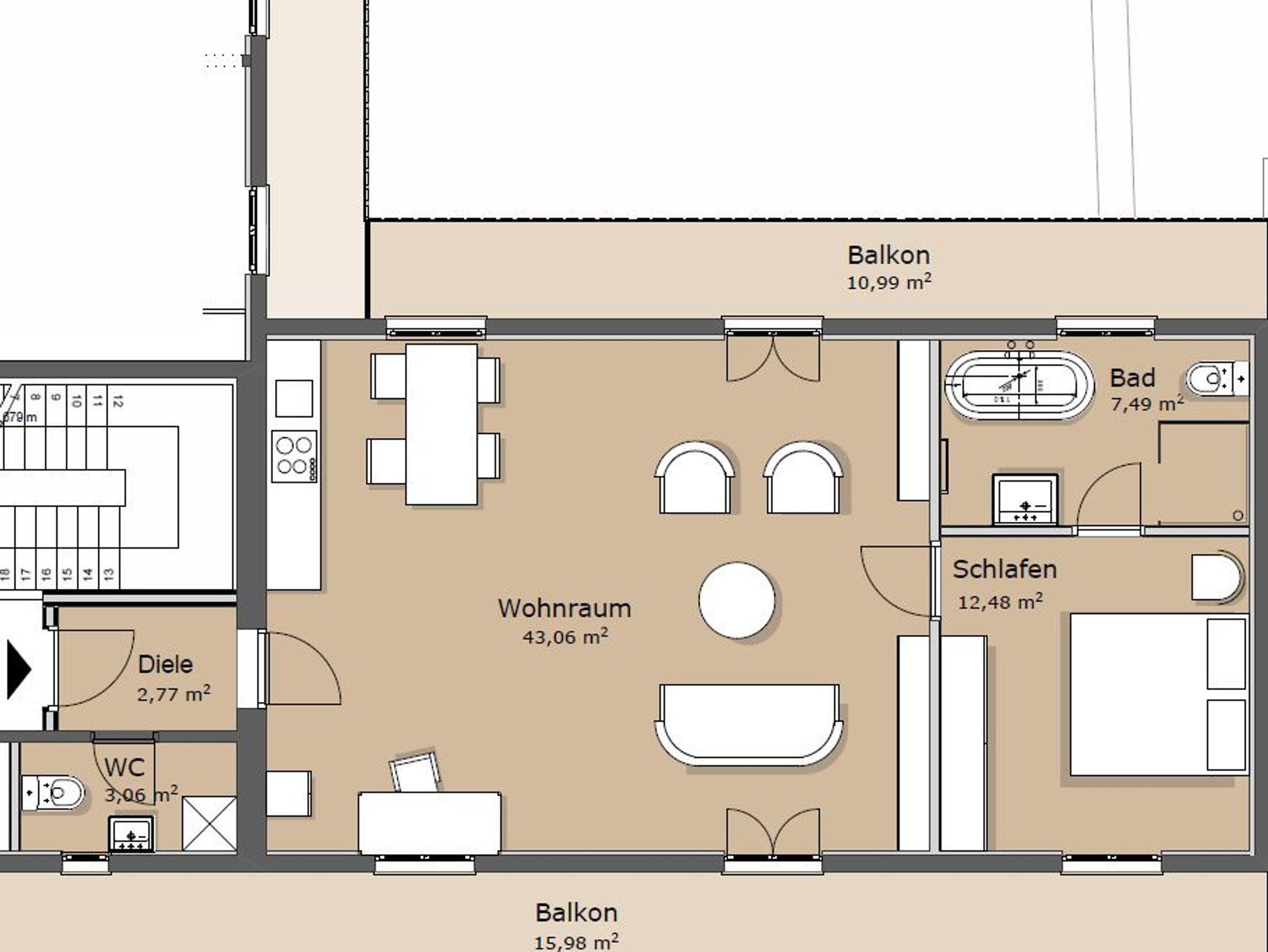 Die Ferienwohnung Schiefer befindet sich im Herrenhaus, OG Nord, und verfügt über einen großzügigen Wohn-Ess-Kochbereich mit Einbauküche, Schlafzimmer mit Tageslichtbad en suite inkl. ebenerdiger Dusche und Badewanne, weiteres sep. WC mit Dusche, zwei Balkone mit Blick auf die Saar und die Weinberge, umlaufender Balkon.