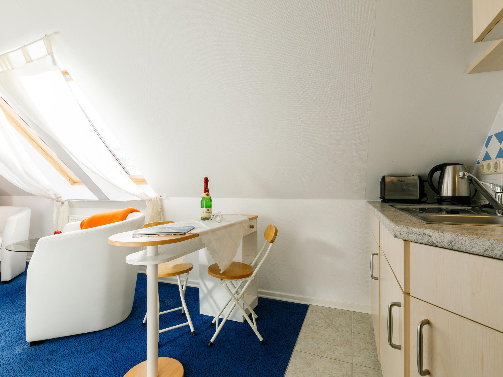 "Tauchmann I", 1-room apartment 30 m2, on the top floor. With sloping ceilings, practical furnishings: living/sleeping room with 1 double bed and cable TV (flat screen), radio. Kitchenette (2 ceramic glass hob hotplates, toaster, kettle, electric coffee machine). Shower/WC. Carpet. Please note: non-smokers only. Smoke alarm.