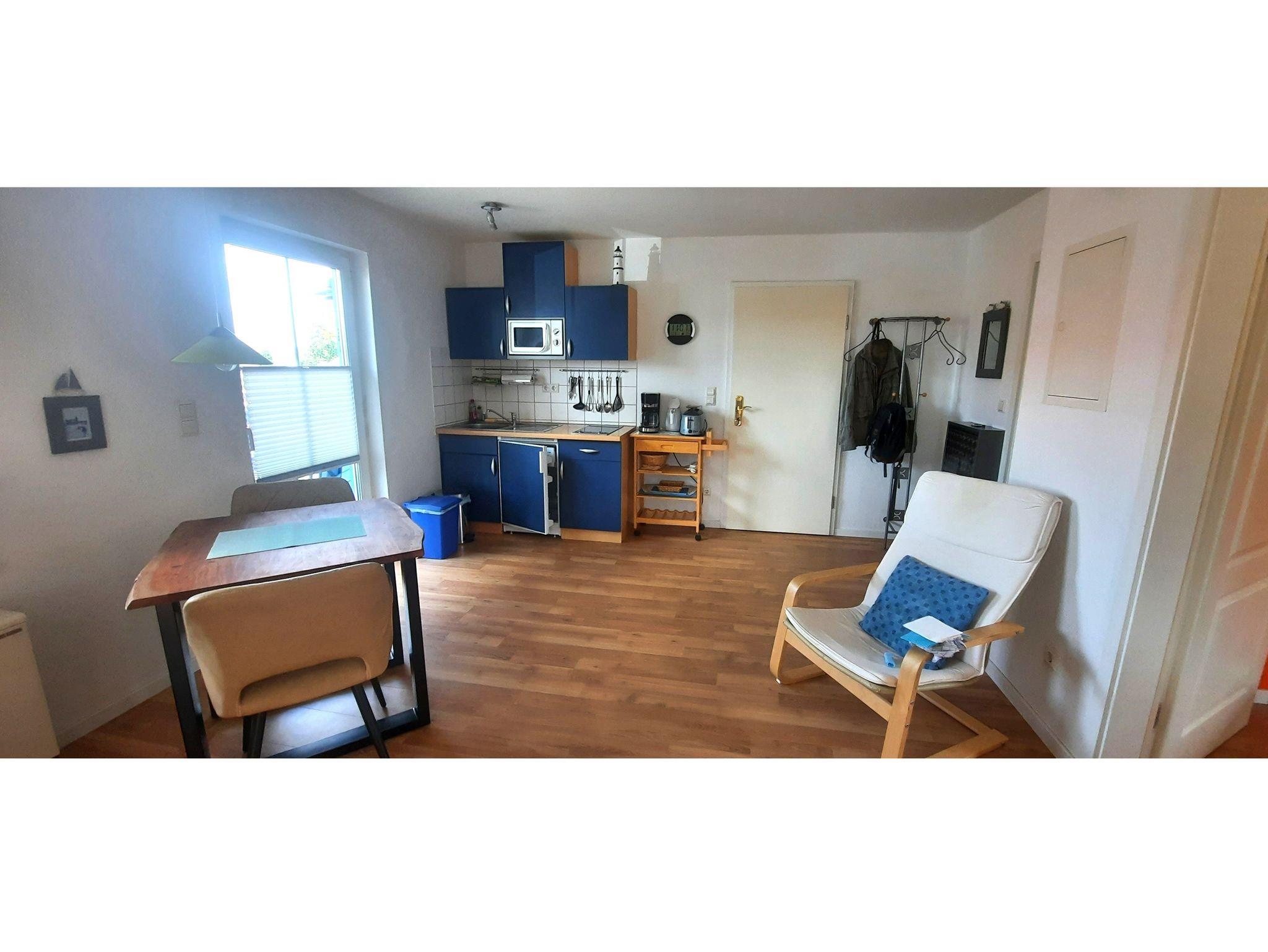 Gemütliche 2-Zimmer Ferienwohnung im 1. Obergeschoss einer freundlich angelegten Ferienanlage. Die Ferienwohnung ist im Wohnbereich ausgestattet mit einer Couch, Flachbild-TV und einer offenen Küche mit Essbereich.