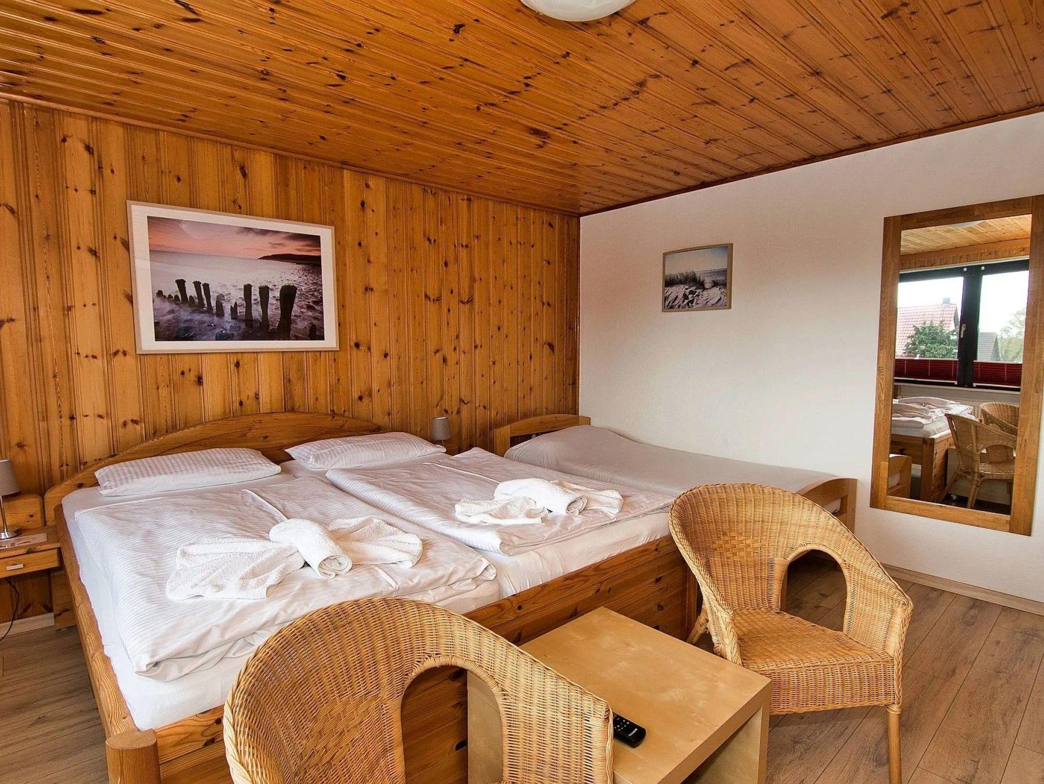 hr Appartement Olaf umfasst die ganze obere Etage des Einfamilienhauses und besitzt einen eigenen separaten Eingangsbereich. Sie gelangen über eine Außentreppe in Ihre Ferienwohnung und auf die dazugehörige Terrasse. Ihre eigene Terrasse mit den dazugehörigen Terrassenmöbeln inkl. Strandkorb, lädt Sie förmlich ein, ein traumhaftes Frühstück beim morgendlichen Sonnenschein einzunehmen. Ihr Appartement besteht aus einem Wohnzimmer, einem Schlafzimmer und einer Küche. Ihr schönes Bad ist mit einer Badewanne ausgestattet, so kann Ihr Urlaubstag entspannt beginnen und auch enden. Das Wohnzimmer ist mit Sitzgarnitur, kleiner Anbauwand mit großem LED Flachbildschirm-TV eingerichtet, mit welchem Sie sehr viele regionale, nationale und internationale Fernsehprogramme empfangen können. Wir stellen unseren Gästen WLAN zur Verfügung. Ihre separate Küche ist komplett ausgestattet, unter anderem mit einem Herd, Geschirrspüler, Mikrowelle und Kaffeemaschine. Das Schlafzimmer besitzt ein großes Doppelbett und ein Einzelbett zum Schlummern, Träumen und Relaxen! Im Schlafzimmer befindet sich ein 4K-Fernseher. Ebenso sind Nachttische und Kleiderschrank vorhanden. Wenn Sie möchten, können Sie auch Zwischenreinigungen zu je 90,-€ zubuchen. Im Garten stehen eine Sitzgruppe und ein Strandkorb zum entspannen sowie für die Trocknung der Strand- und Badesachen eine Wäschespinne bereit. Bei Bedarf, können Sie unseren Waschsalon mit Waschmaschine, Trockner und Bügelbrett in der Hotel & Ferienpension Elisabeth im Jugendweg 18 nutzen.