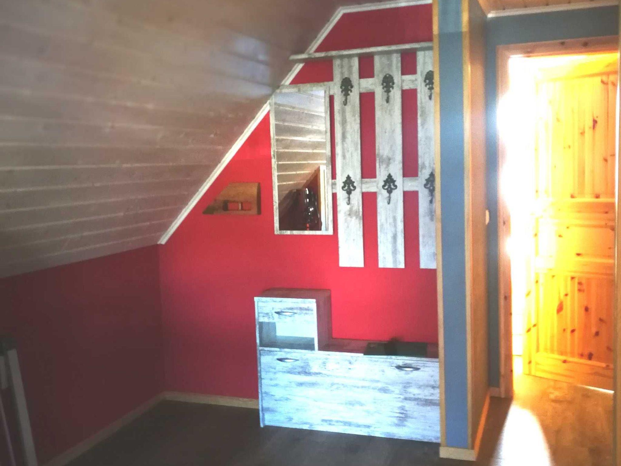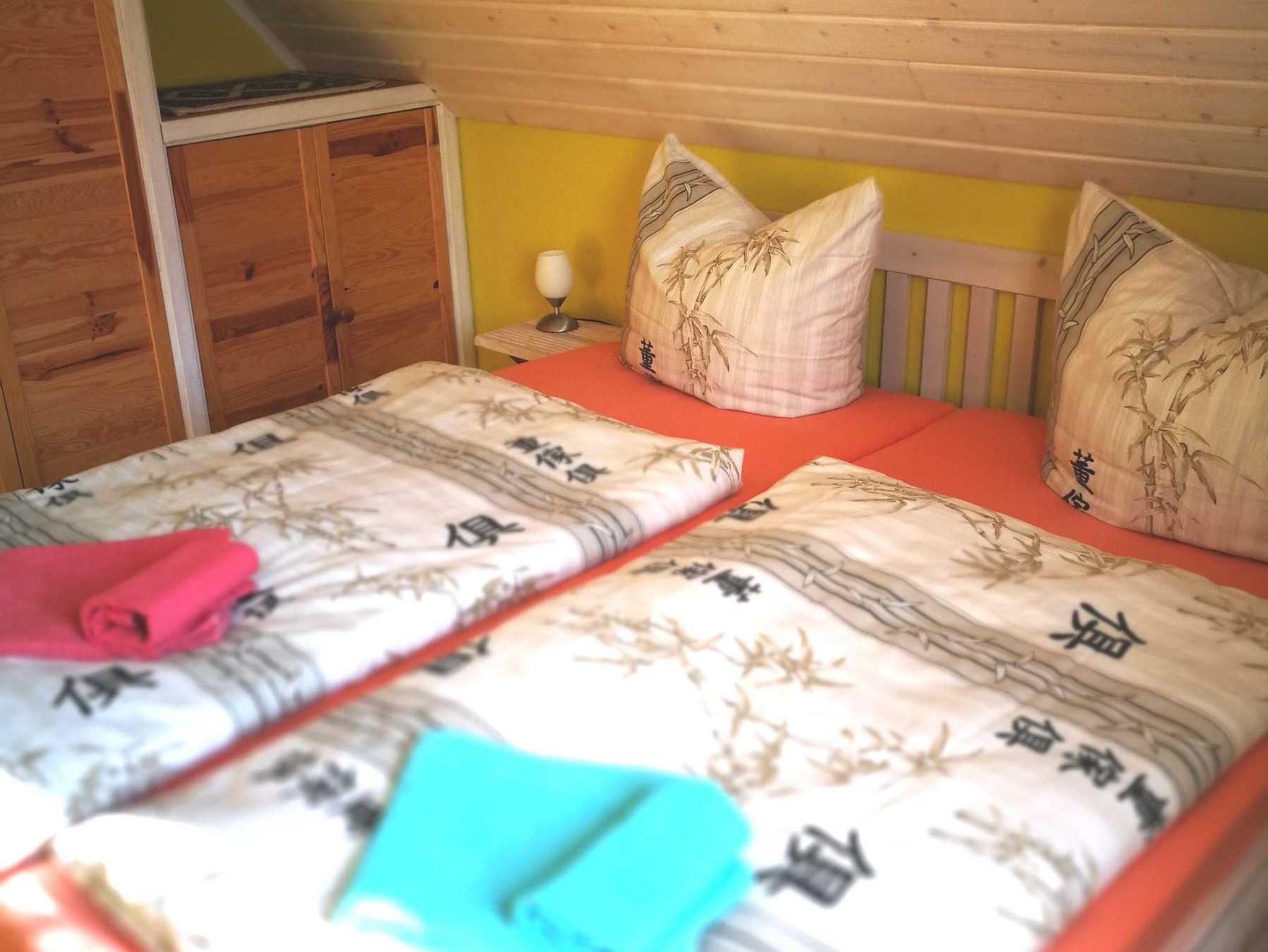 Besonderes Highlight in der Ferienwohnung: Im ausgebauten Spitzboden befindet sich zwei weiterere Schlafplätze - diese sind über eine steile Holzleiter zu erreichen. Möchten Sie für 6 Personen (2 Aufbettungen im Spitzboden) buchen, kontaktieren Sie uns bitte telefonisch. Damit es zu jeder Jahreszeit schön kuschelig ist, sorgt ein Pelletofen für romantische Stimmung. Im Mietpreis ist ein Sack Pellets enthalten, weitere können jederzeit beim Vermieter gegen Entgelt erworben werden. Die offene Küche ist mit Kaffeemaschine, Wasserkocher, Toaster und Mini-Ofen ausgestattet. Das Bad mit Dusche und WC. Haustiere sind nicht gestattet.