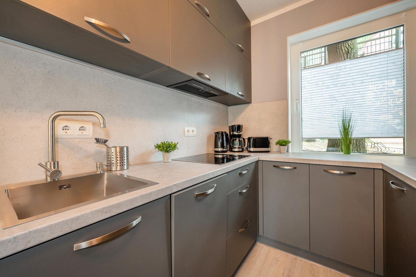Das Wohnzimmer ist mit einem großen Sofa mit Schlaffunktion, einem Bücherregal und einem TV zu Ihrer Unterhaltung ausgestattet. Durch den Schnitt des Raumes, sind die offene Küche und der Esstisch in einem Erker wunderbar vom Wohnzimmer abgegrenzt. Das Zusammenspiel vieler kleiner Details verwandelt diesen Raum in einen absoluten Wohlfühlort. Die Küchenzeile bietet Ihnen mit einer umfangreichen Grundausstattung auch im Urlaub die Möglichkeit eigene Mahlzeiten zuzubereiten. Über das Wohnzimmer erreichen Sie die anliegende Terrasse. Durch die Überdachung kann man hier auch bei weniger schönen Wettermomenten die Ostseeluft genießen. Das Schlafzimmer bietet Ihnen ein gemütliches Doppelbett (1,80 x 2,00 Meter Liegefläche) und einen Kleiderschrank, welcher ausreichend Platz für Ihre Garderobe bereithält. Ins Bad gelangen Sie dank zwei Eingängen immer auf kurzen Wegen. Waschbecken, WC, eine Dusche und ausreichend Ablageflächen werden Sie hier ebenfalls vorfinden.