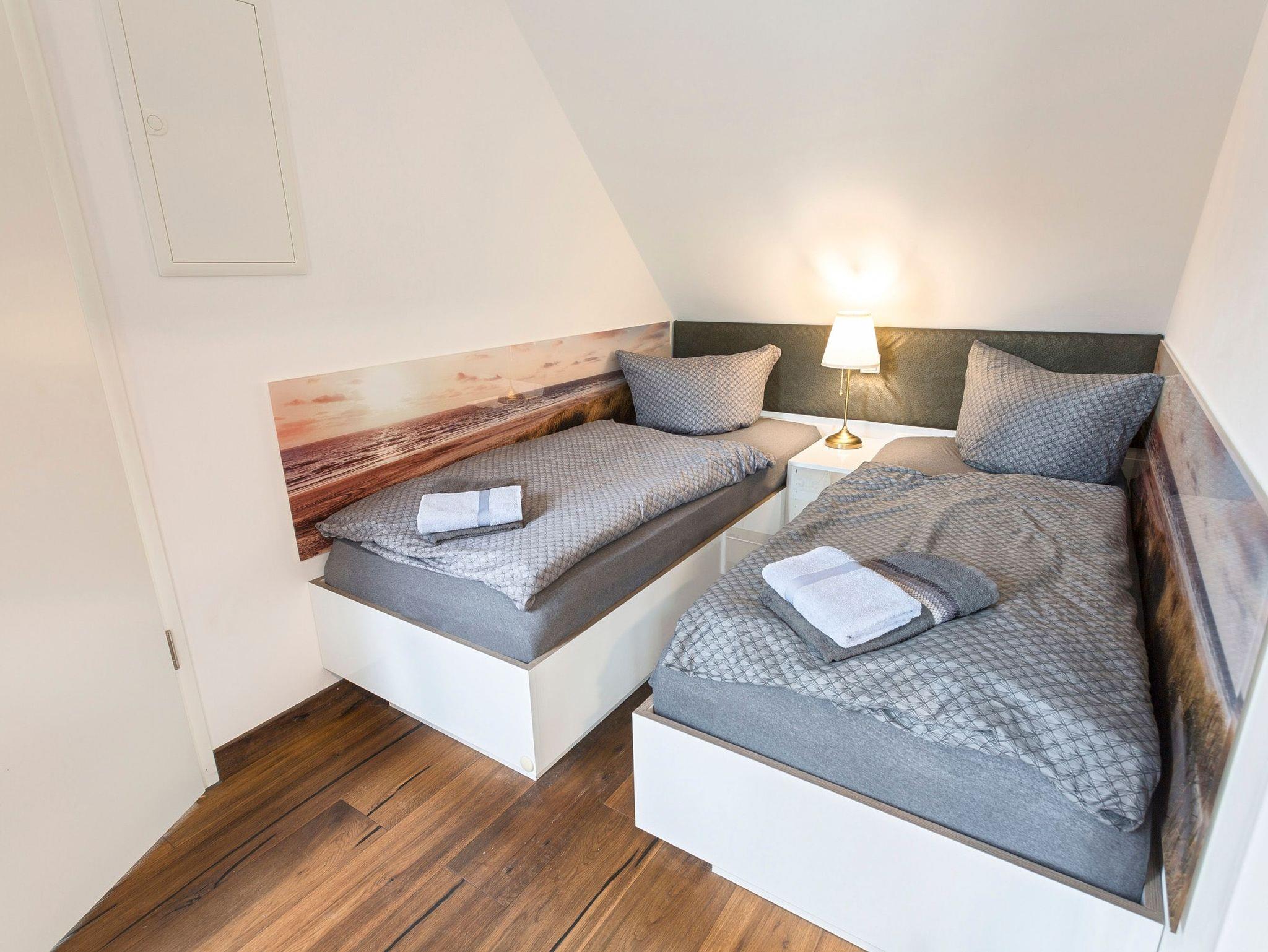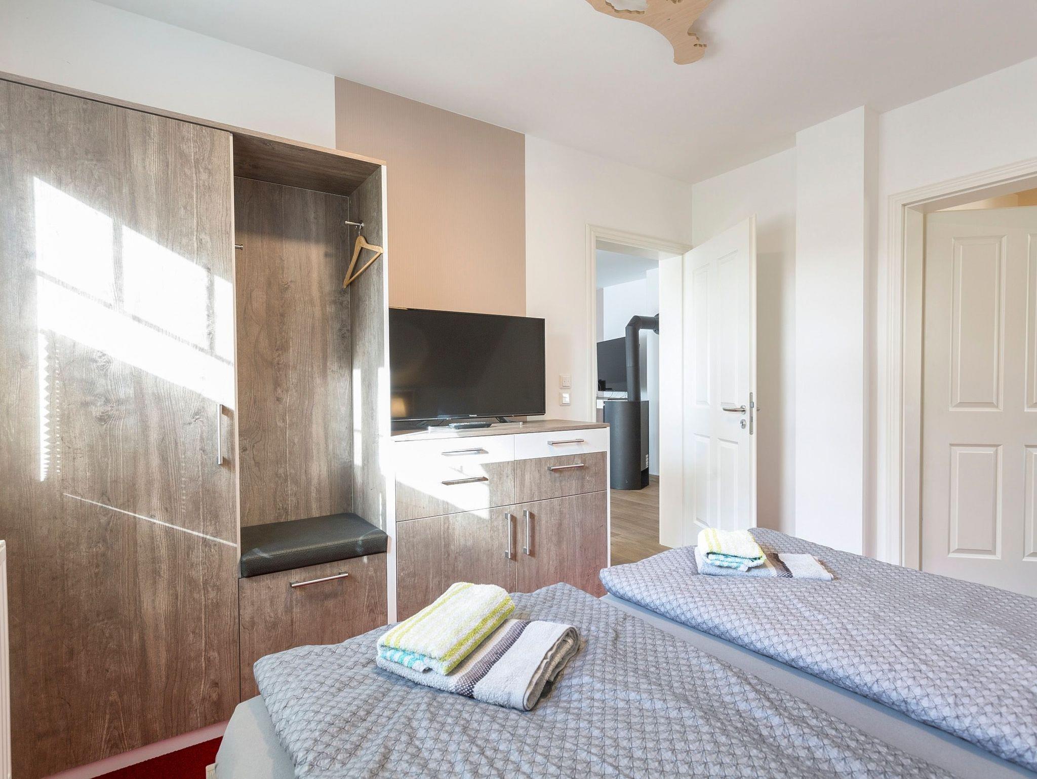 3 separaten Schlafzimmer sind mit Doppelbett (180x200; getrennte Matratzen, einzeln stellbar), Smart-TV, Kleiderschrank und Sessel ausgestattet. Das Schlafzimmer im Dachgeschoss hat zusätzlich einen eigenen Balkon. Die Fenster sind mit elektrischen Außenjalousien verdunkelbar und mit Insektenschutz versehen.