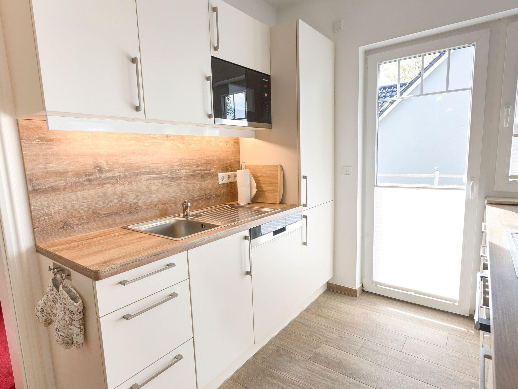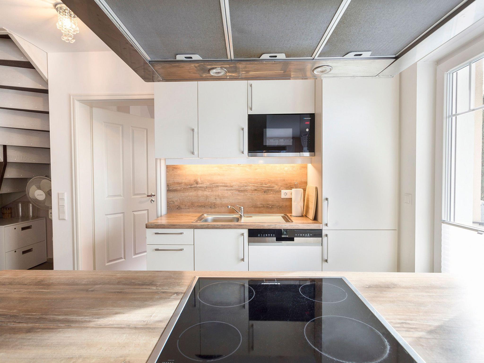 Im großzügigen Wohnbereich erwarten Sie eine gemütliche Wohnlandschaft, Kamin, Smart-TV, eine offen gestaltete Küche sowie ein großer Esstisch. Die Küche ist umfangreich ausgestattet mit Kühlschrank, Gefrierschrank, Ceran-Kochfeld, Backofen, Spülmaschine, Mikrowelle, Kaffeemaschine, Wasserkocher, Toaster und alle den kleinen Dingen des täglichen Bedarfs. Weiterhin befindet sich an den Küchenbereich angeschlossen ein kleiner Balkon.