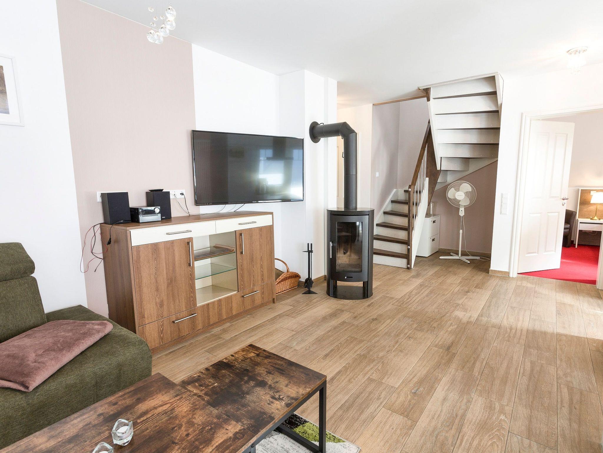Die beiden Ferienwohnungen im Erdgeschoss verfügen jeweils über einen Wohnraum mit integrietem Küchen- und Essbereich und Kaminofen, 2 Schlafzimmer, zwei Bäder und eine eigene Sauna.
