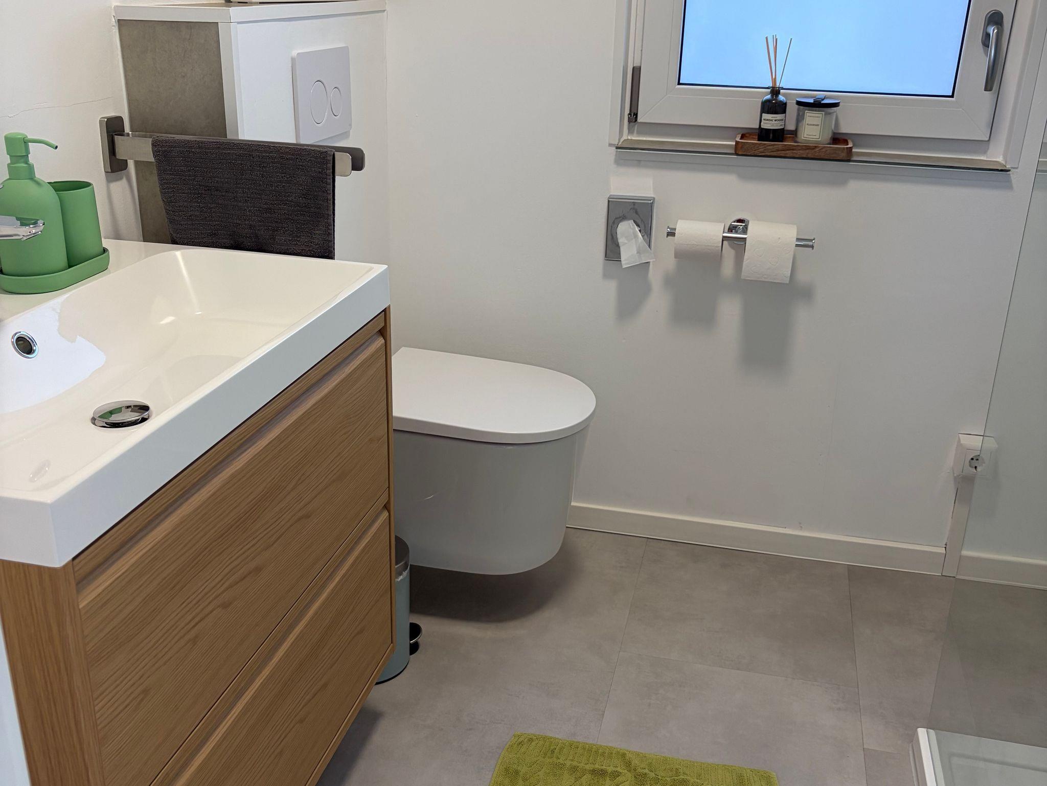 Das moderne Badezimmer verfügt über Dusche, Waschbecken, WC sowie einen 80-Liter-Boiler für warmes Wasser.