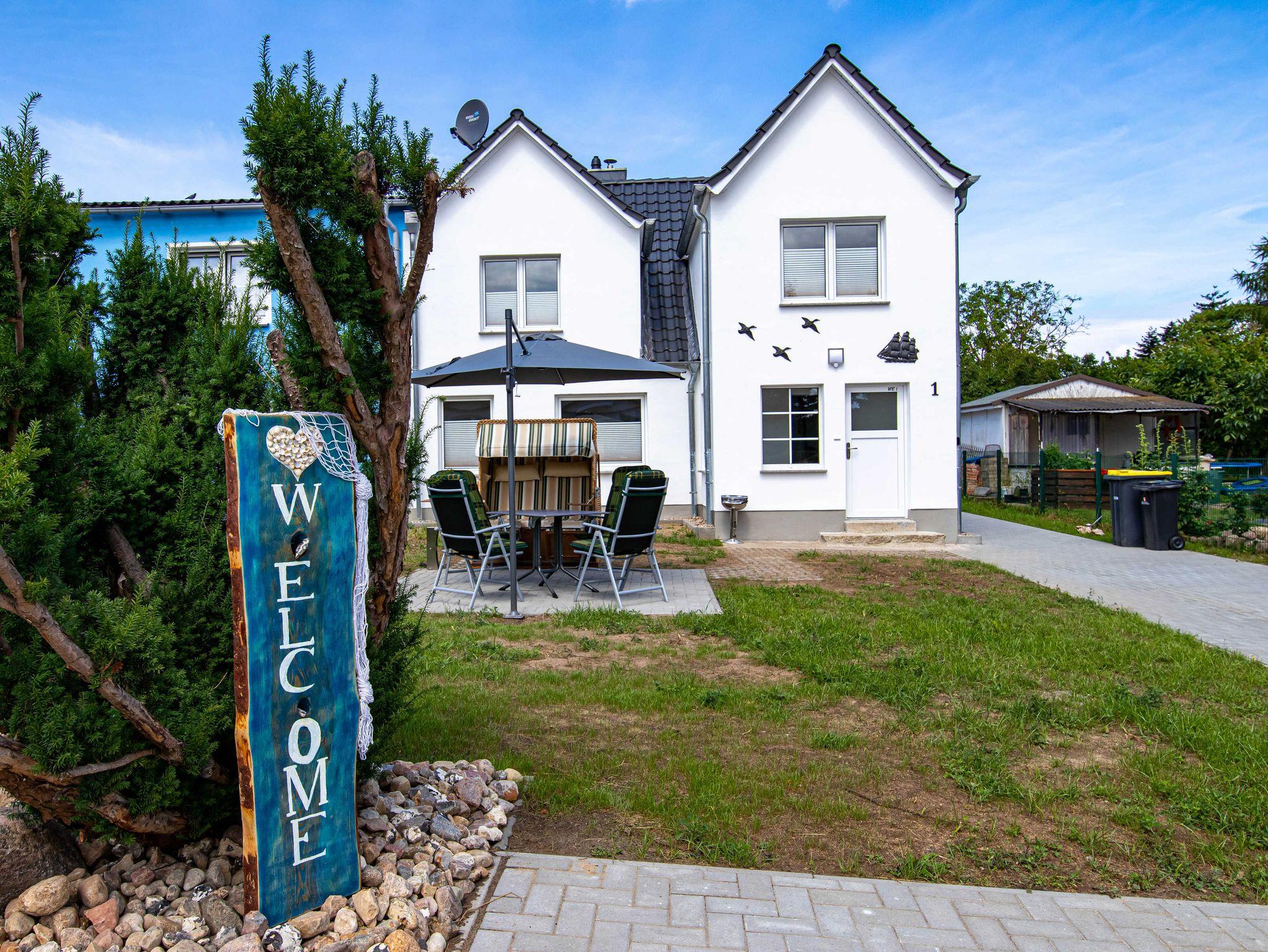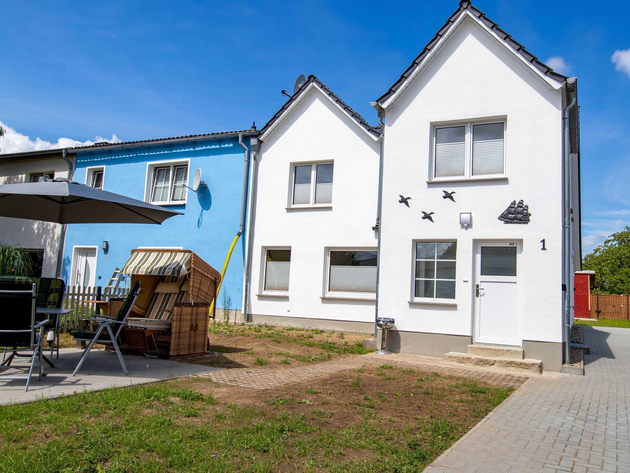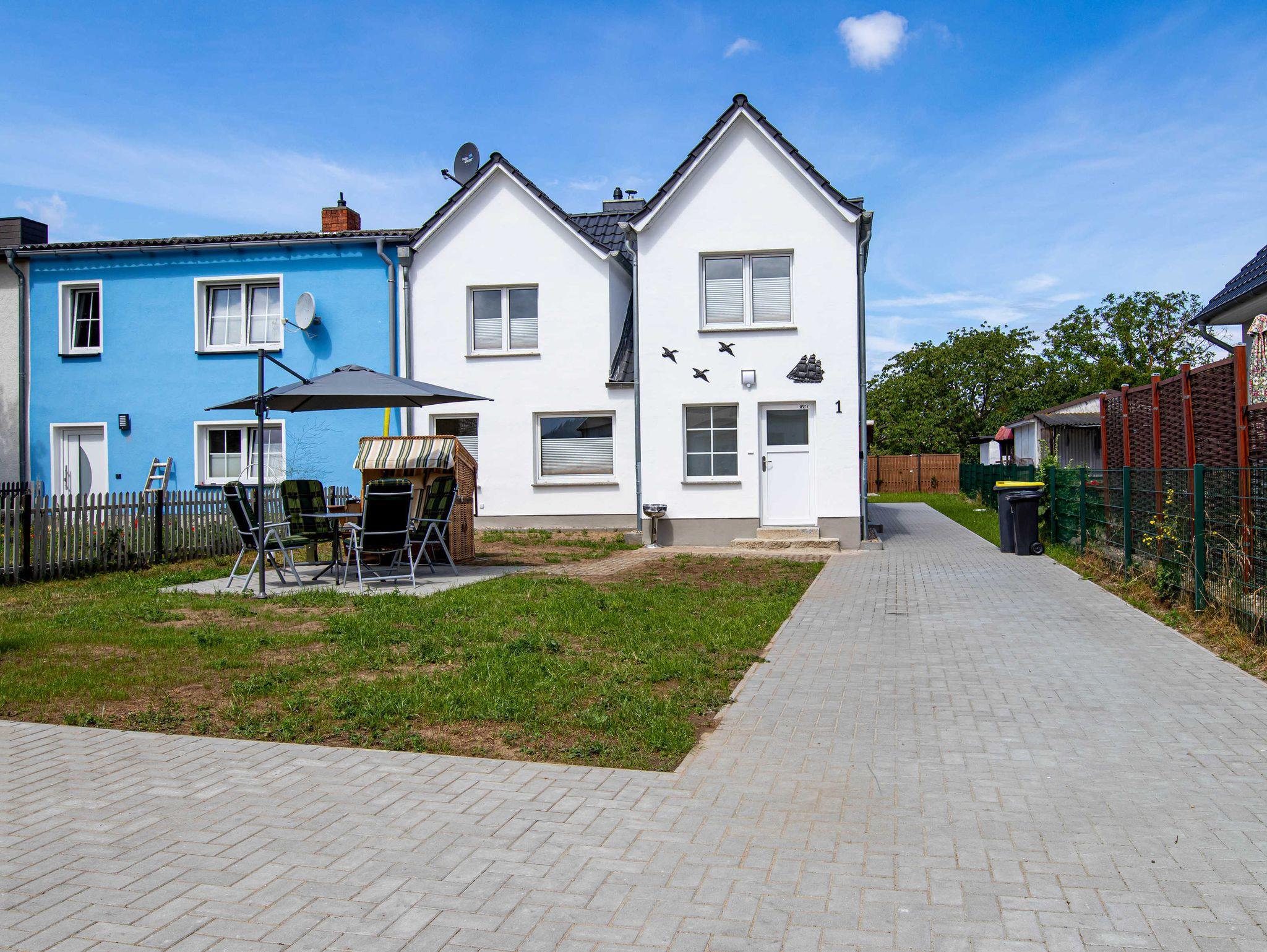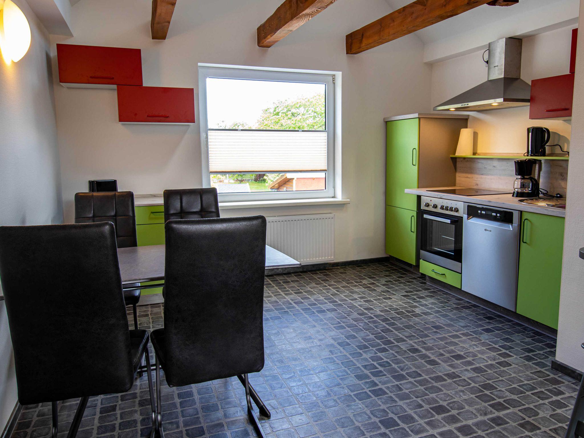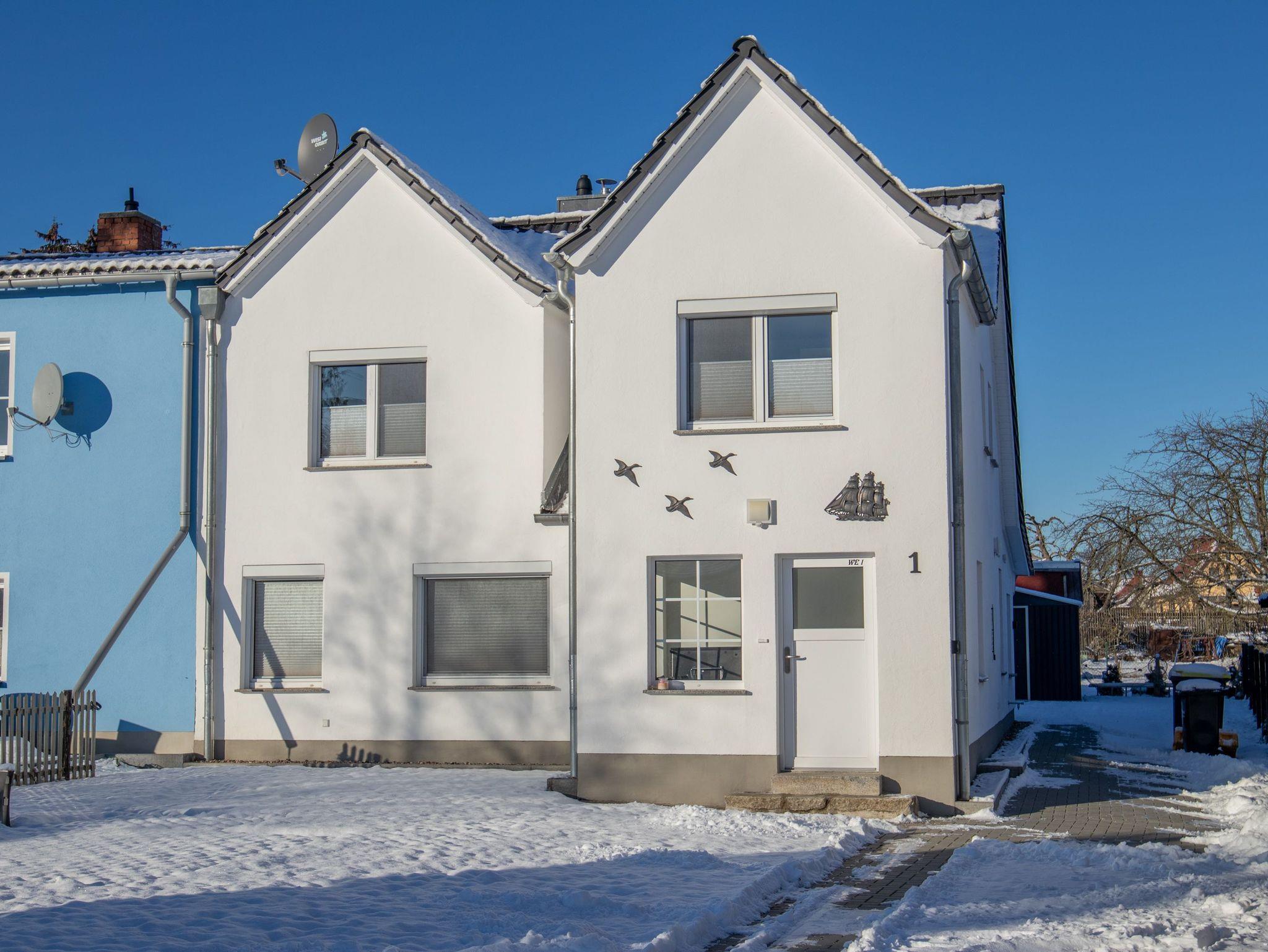 Die 65m² große Ferienwohung befindet sich im Obergeschoss eines Ferienhauses mit 2 Ferienwohnungen. Sie verfügt über ein gemütliches Wohnzimmer mit einer Schlafcouch und TV, ein Schlafzimmer mit Doppelbett, einen offenen Schlafboden mit 2 Matratzen (sehr niedrige Deckenhöhe - eher für Kinder geeignet), eine offene Küche mit Kühlschrank, Gefrierschrank, Cerankochfeld (4 Platten), Backofen, Toaster, Wasserkocher, Kaffeemaschine und einen Esstisch für alle Personen sowie über ein großes Tageslichtbad mit Dusche und WC. Vor der Wohnung gibt es eine eigene möblierte Terrasse mit Grill und Strandkorb.