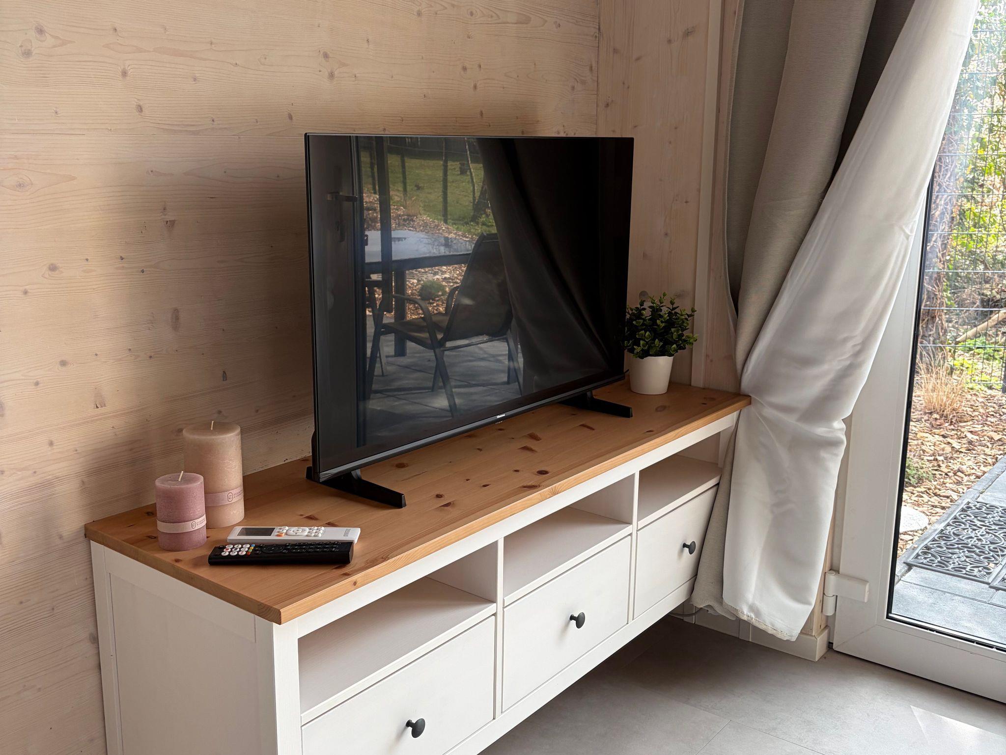 Ein heller Wohnraum mit großer Fensterfront, Schlafcouch (140 cm Breite, mit Matratze) und Fernseher sorgt für Gemütlichkeit. Von hier gelangen Sie direkt auf die möblierte Terrasse ideal für Mahlzeiten im Freien oder entspannte Abende.
