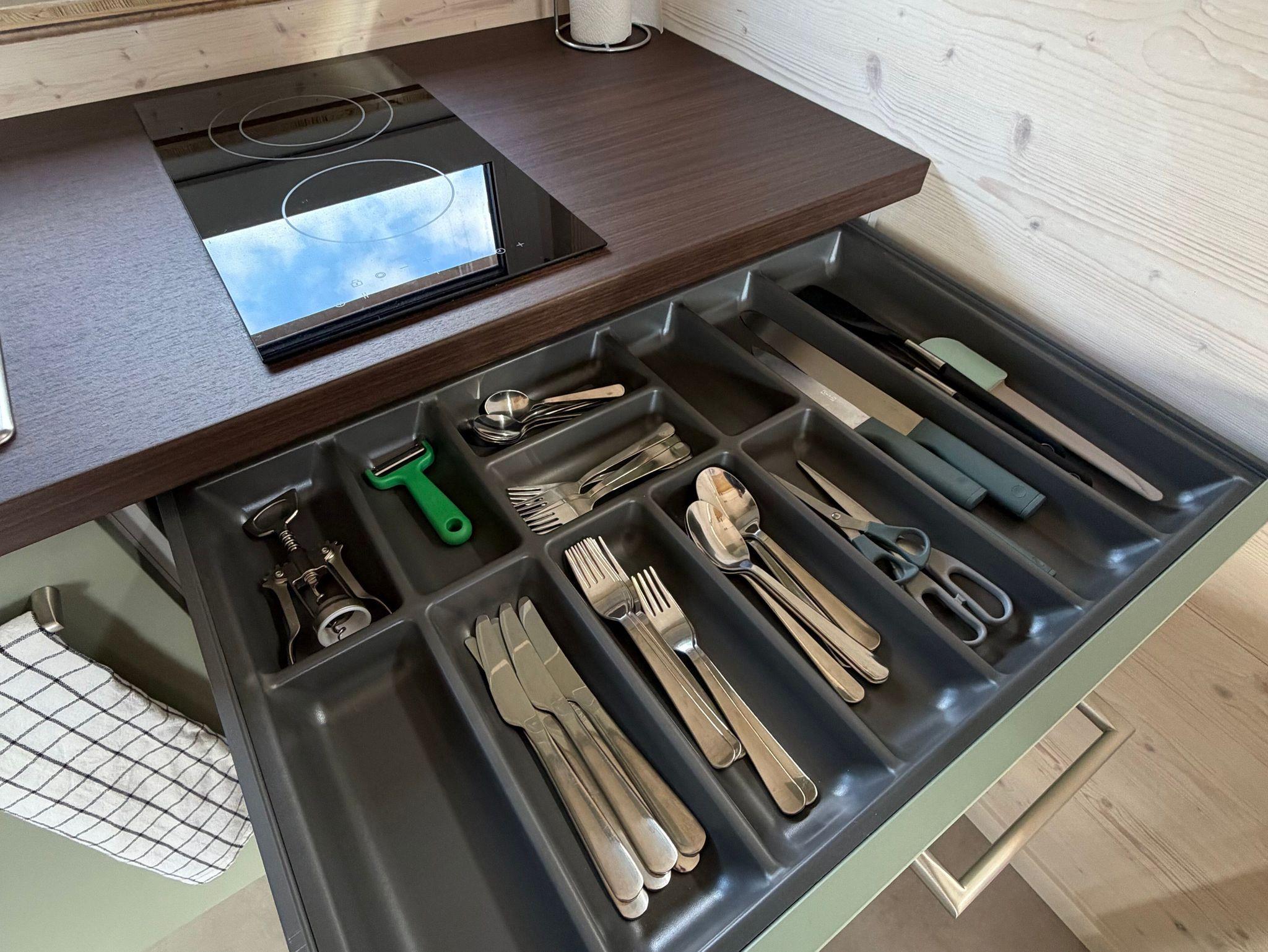 Die moderne Küchenzeile ist mit einem 2-Platten-Ceranfeld, kleinem Backofen, Wasserkocher, Kaffeemaschine und Kühlschrank ausgestattet. Am praktischen Esstisch finden bis zu vier Personen Platz. Die Küche ist vollständig ausgestattet, sodass Sie sich bequem selbst versorgen können.