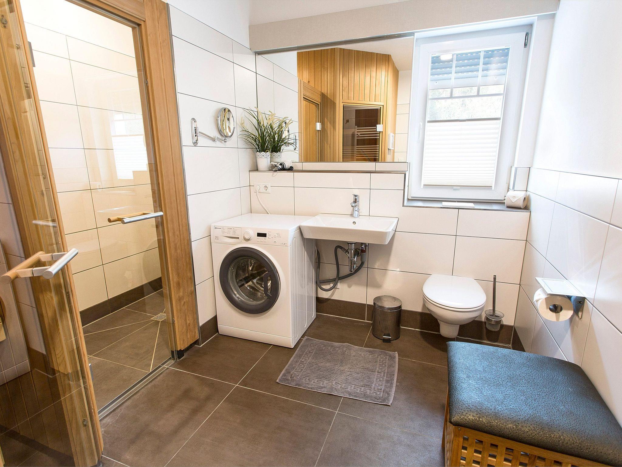 Ein Badezimmer ist mit Badewanne, Föhn und WC ausgestattet, das 2. Badezimmer mit Dusche, Föhn und WC, Waschmaschine und eigener Sauna, welche kostenfrei zur Verfügung steht.