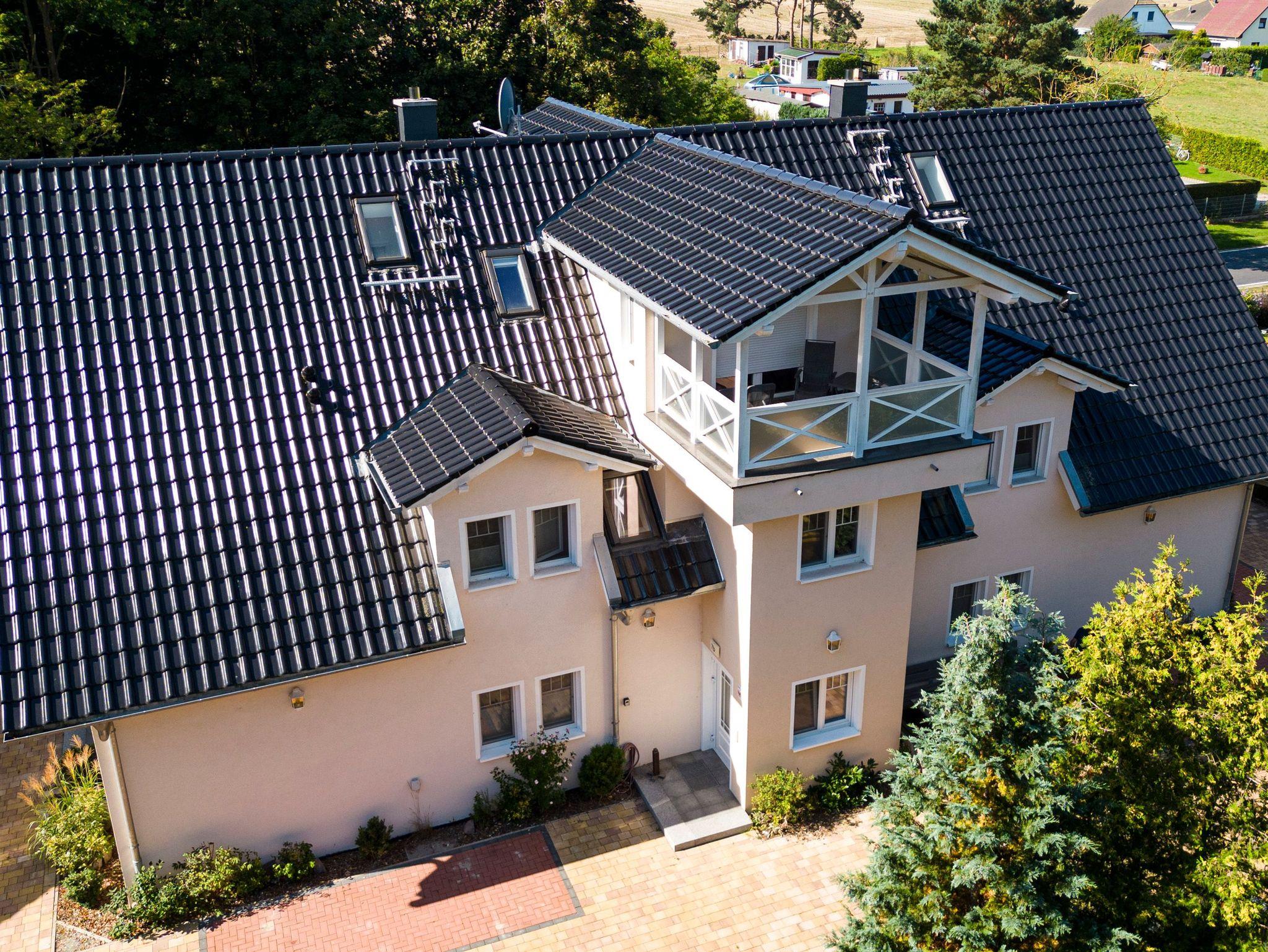 Die zwei Ferienwohnungen im Obergeschoss verfügen jeweils über einen Wohnraum mit integriertem Küchen- und Essbereich und Kaminofen, vier separaten Schlafzimmern mit Balkonen und drei Bädern. Die Ferienwohnung Usedom hat einen 40m² großen Saunabereich mit Dusche, Ruheliegen und Balkon.