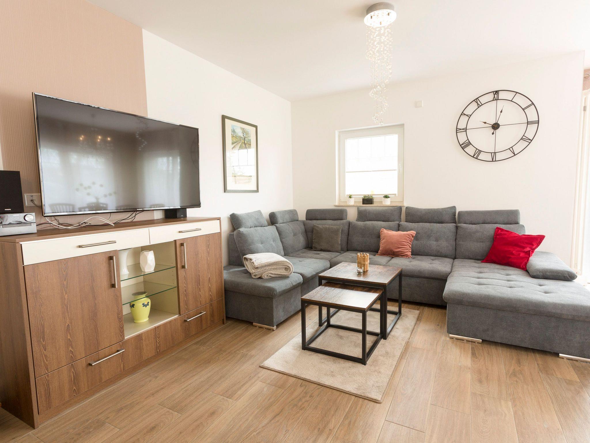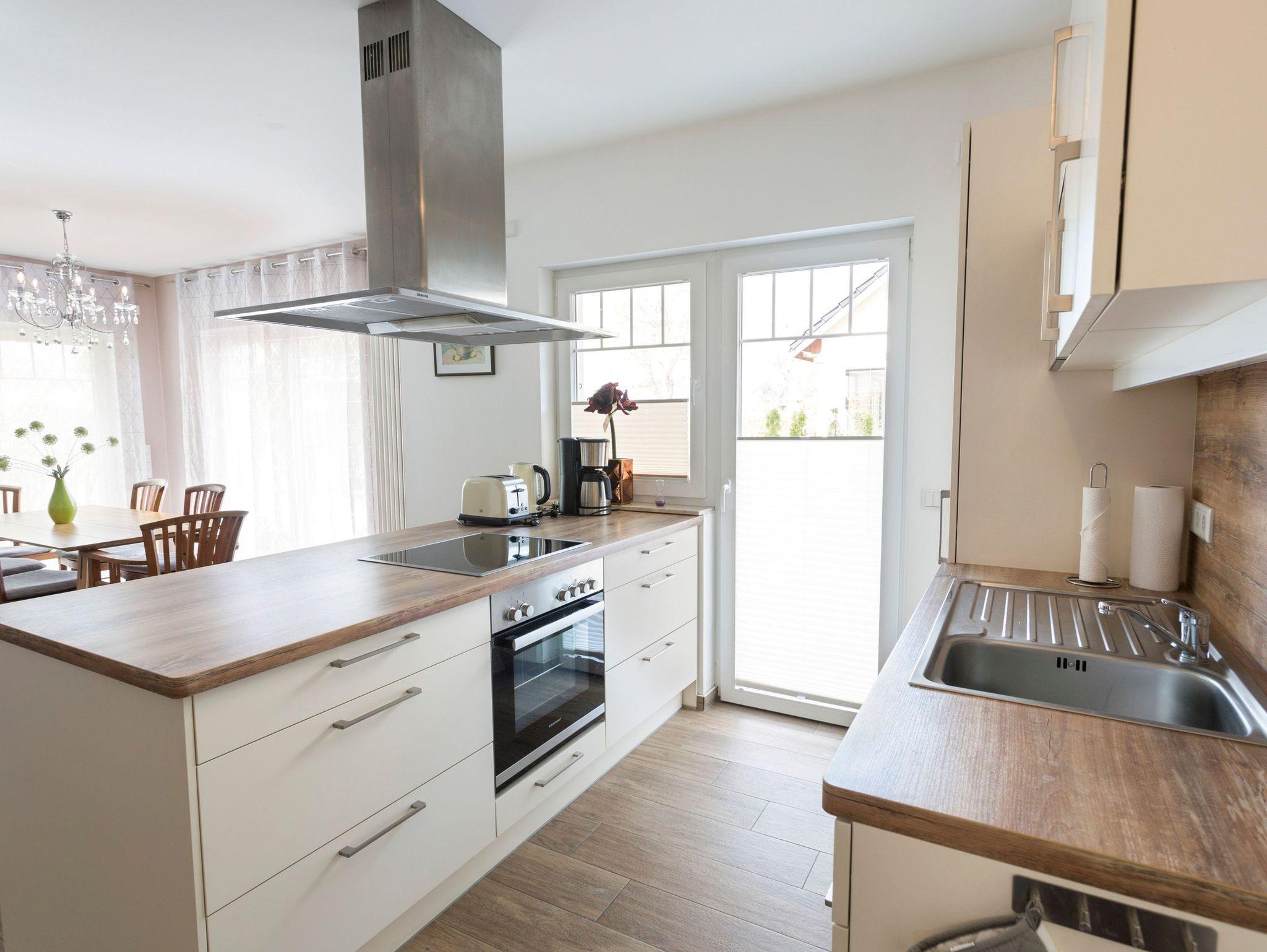 Im großzügigen Wohnbereich erwarten Sie eine gemütliche Wohnlandschaft, Kamin, Smart-TV, eine offen gestaltete Küche sowie ein großer Esstisch. Die Küche ist umfangreich ausgestattet mit Kühlschrank, Gefrierschrank, Ceran-Kochfeld, Backofen, Spülmaschine, Mikrowelle, Kaffeemaschine, Wasserkocher, Toaster und alle den kleinen Dingen des täglichen Bedarfs.