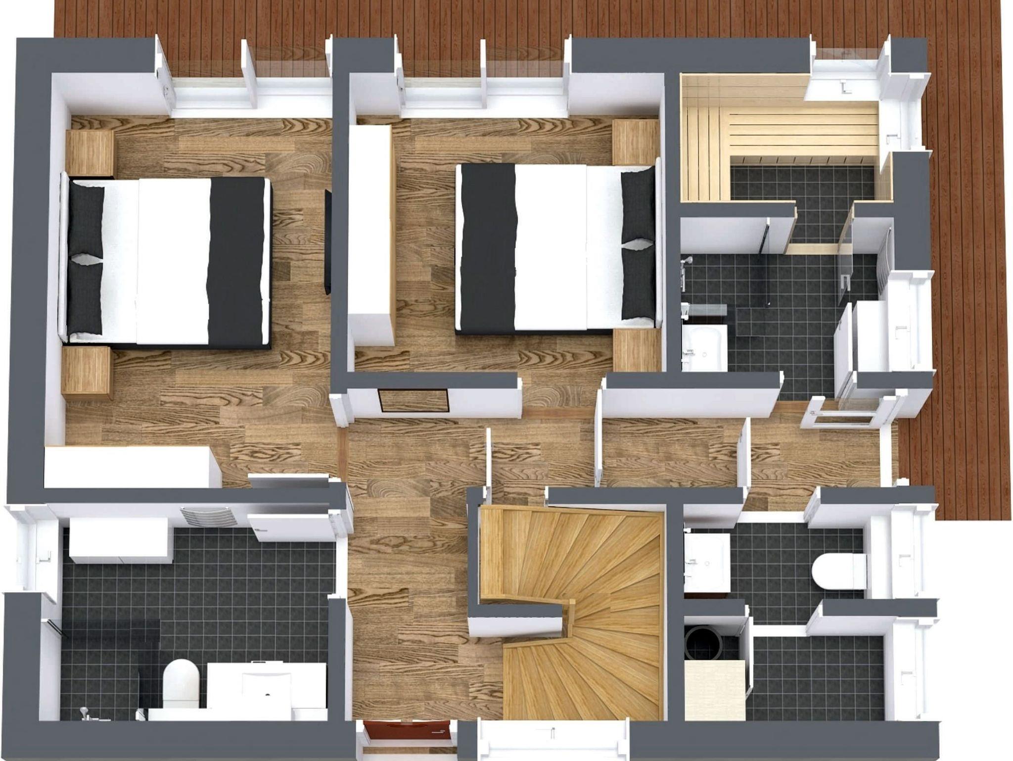 Neben den 2 separaten Schlafzimmern mit Doppelbett befindet sich außerdem ein Bad mit Dusche und Sauna und ein Bad mit Dusche und WC sowie ein Bad mit Waschbecken und WC.