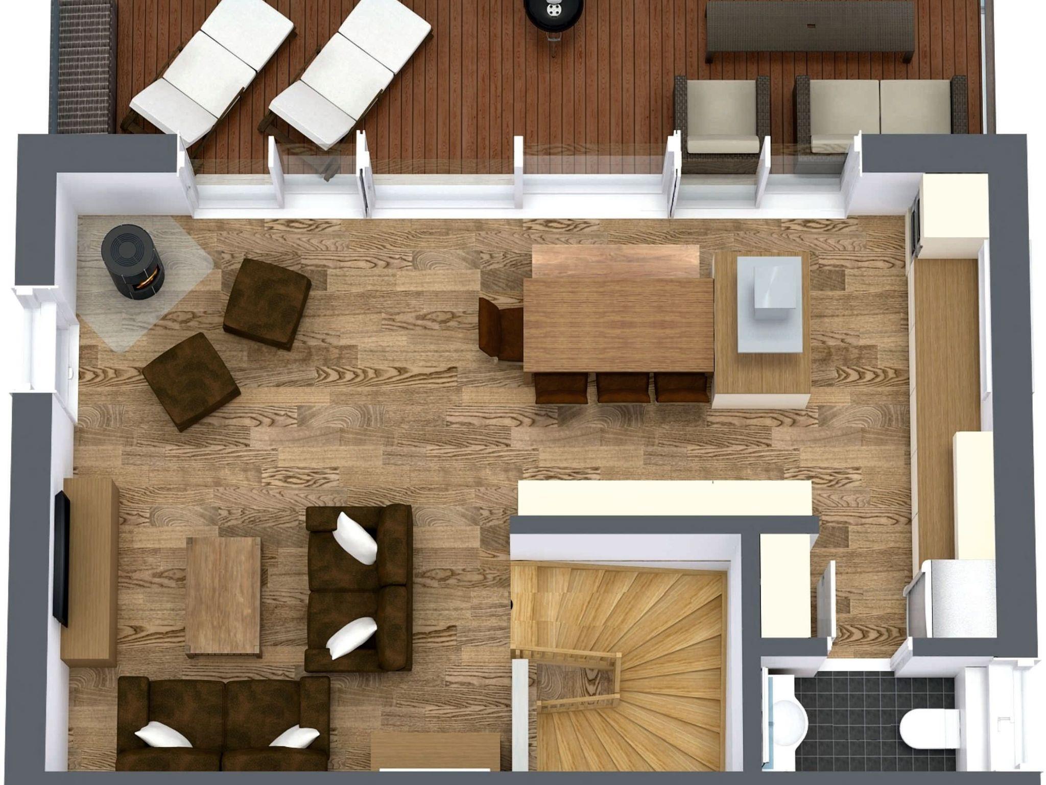 Der lichtdurchflutete Wohnbereich mit Zugang zur Sonnenterrasse, sowie der Küchenbereich und ein separates WC mit Waschbecken befinden sich in der oberen Etage.