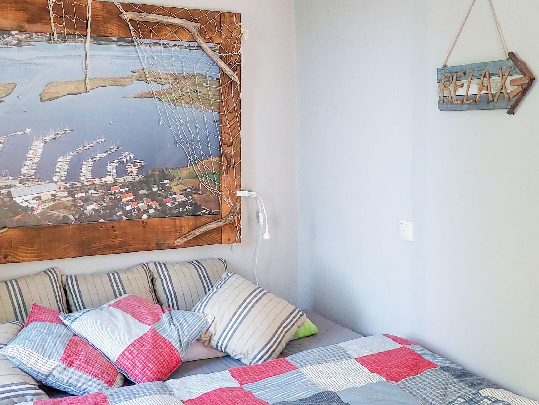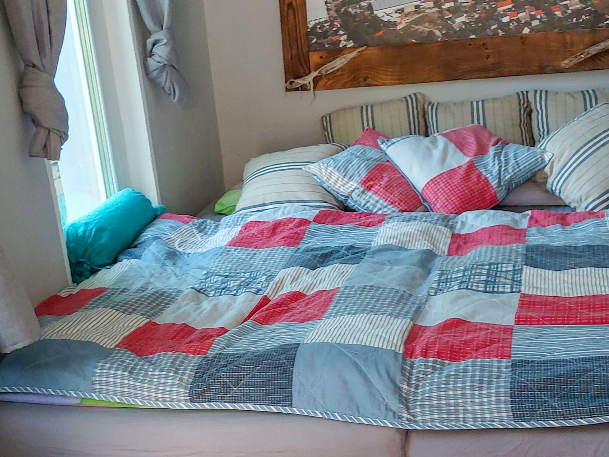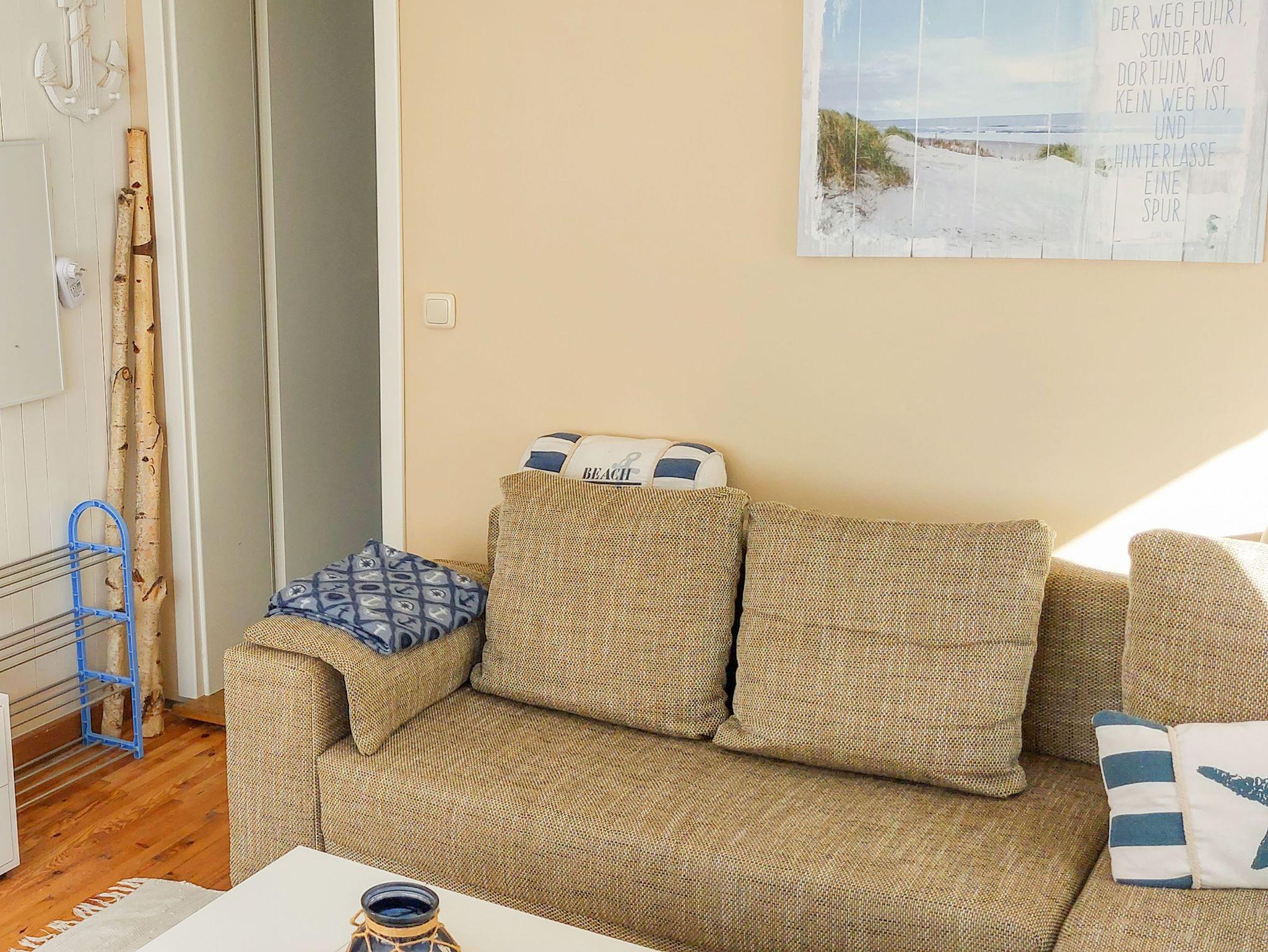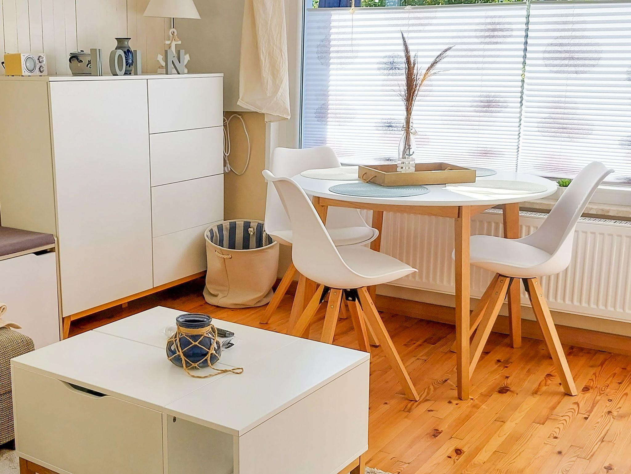 Der Bungalow Koje verfügt auf 28m² Wohnfläche über ein Wohnzimmer mit offener Küche, ein Schlafzimmer, sowie ein Bad mit Dusche. Im Eingangsbereich befindet sich eine Küchenzeile mit Mikrowelle, 2 Herdplatten, Kühlschrank, Kaffeemaschine, Wasserkocher und Geschirr. Im maritimen Wohnzimmer erwartet sie ein gemütliches Schlafsofa (120x200), ein Esstisch und ein TV. Vom hinteren Teil des Wohnzimmers gelangt man in das funktionelle Duschbad mit Fenster. Das Schlafzimmer ist mit einem Doppelbett (180x200) ausgestattet und ebenfalls maritim und gemütlich eingerichtet.