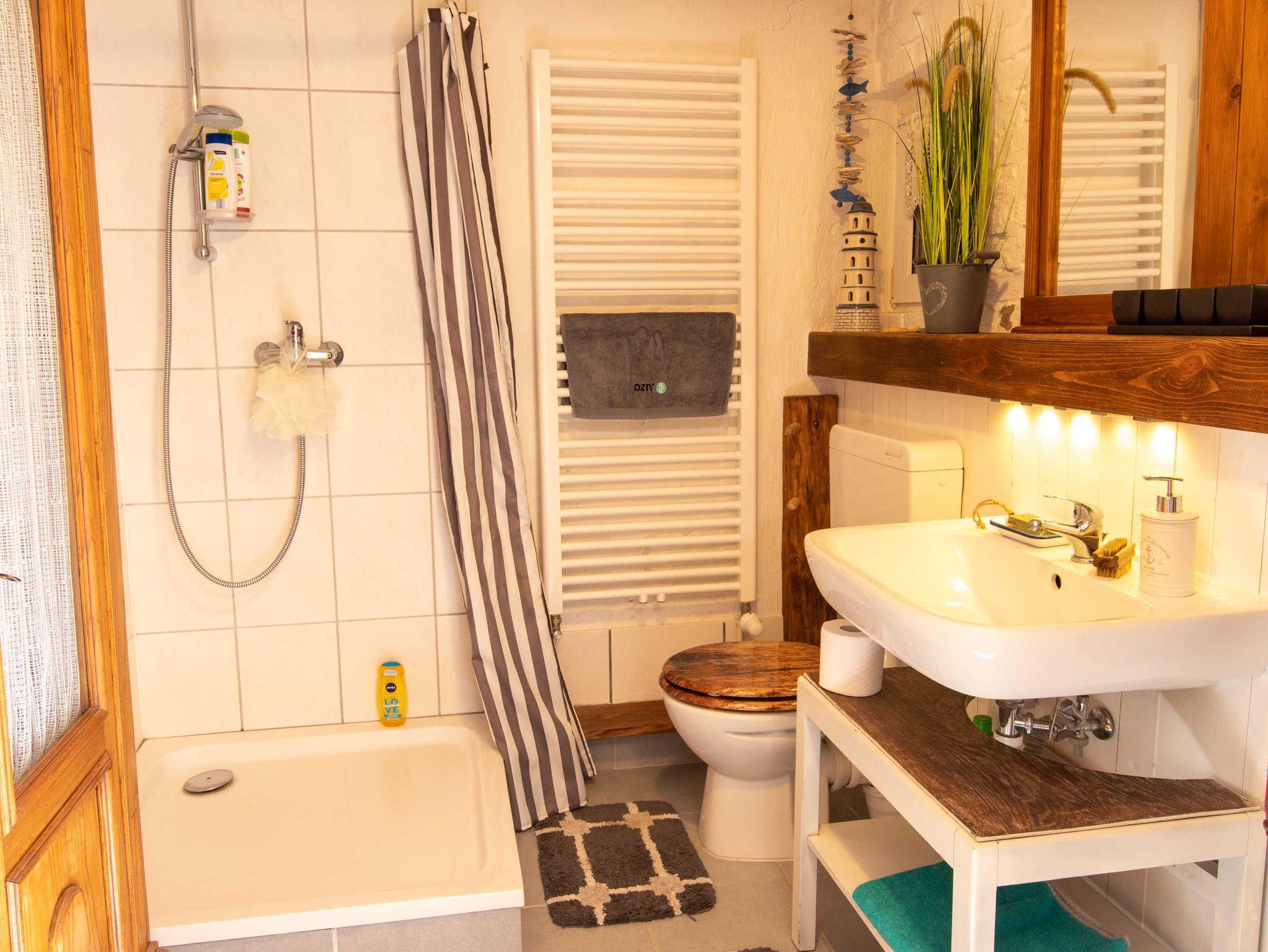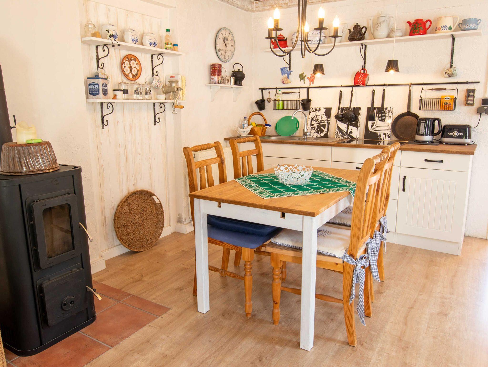 Die ehemalige Scheune liegt parterre und bietet Ihnen neben einem gemütlichen Wohn- und Schlafraum mit Kaminofen, Esstisch und integrierter Küchenzeile, ein Badezimmer mit Dusche und eine große und eine kleine überdachte Terrasse mit Blick ins Grüne auf der Sie so richtig die Seele baumeln lassen können. Mitgebrachte Fahrräder können untergestellt werden.