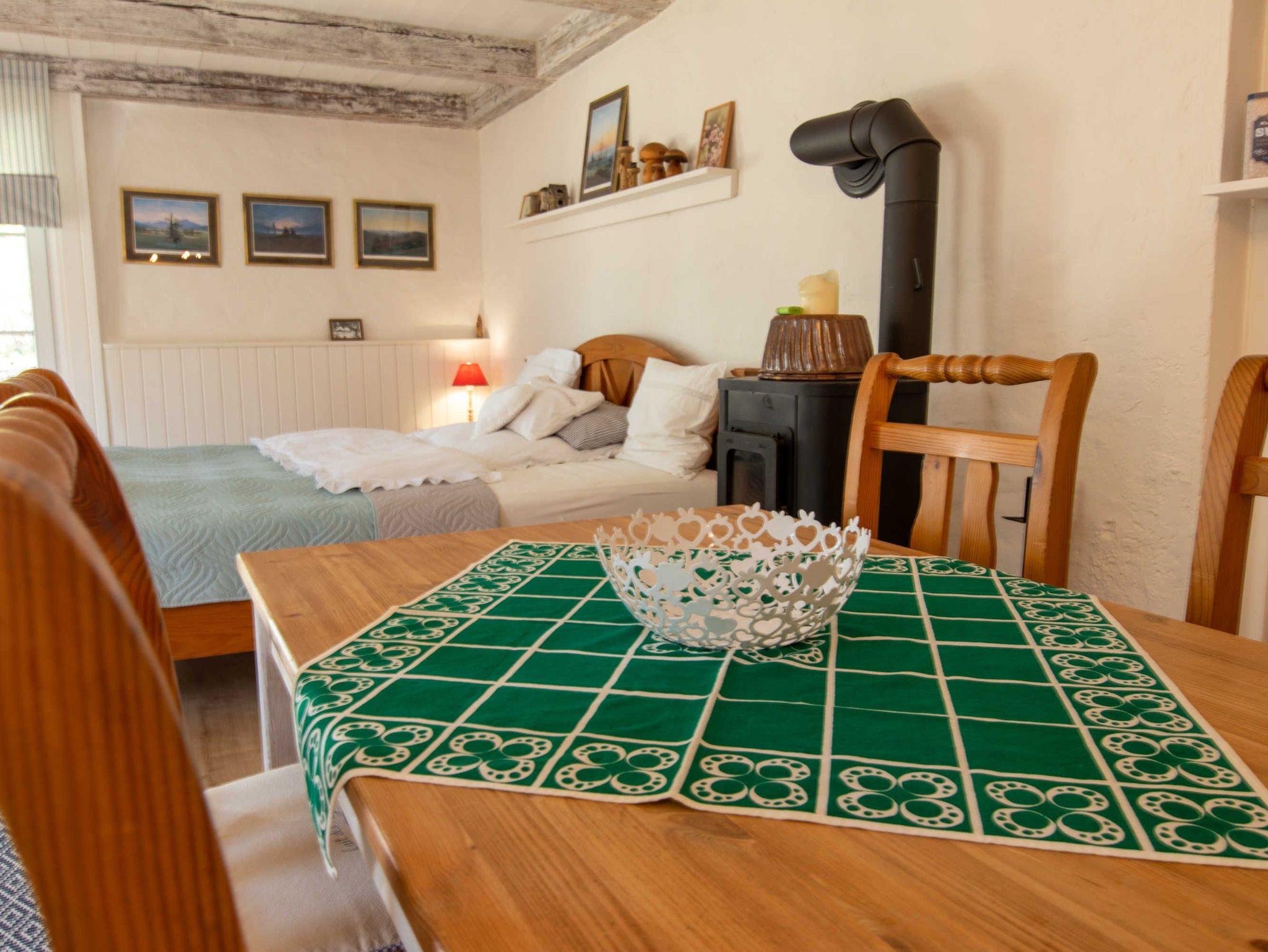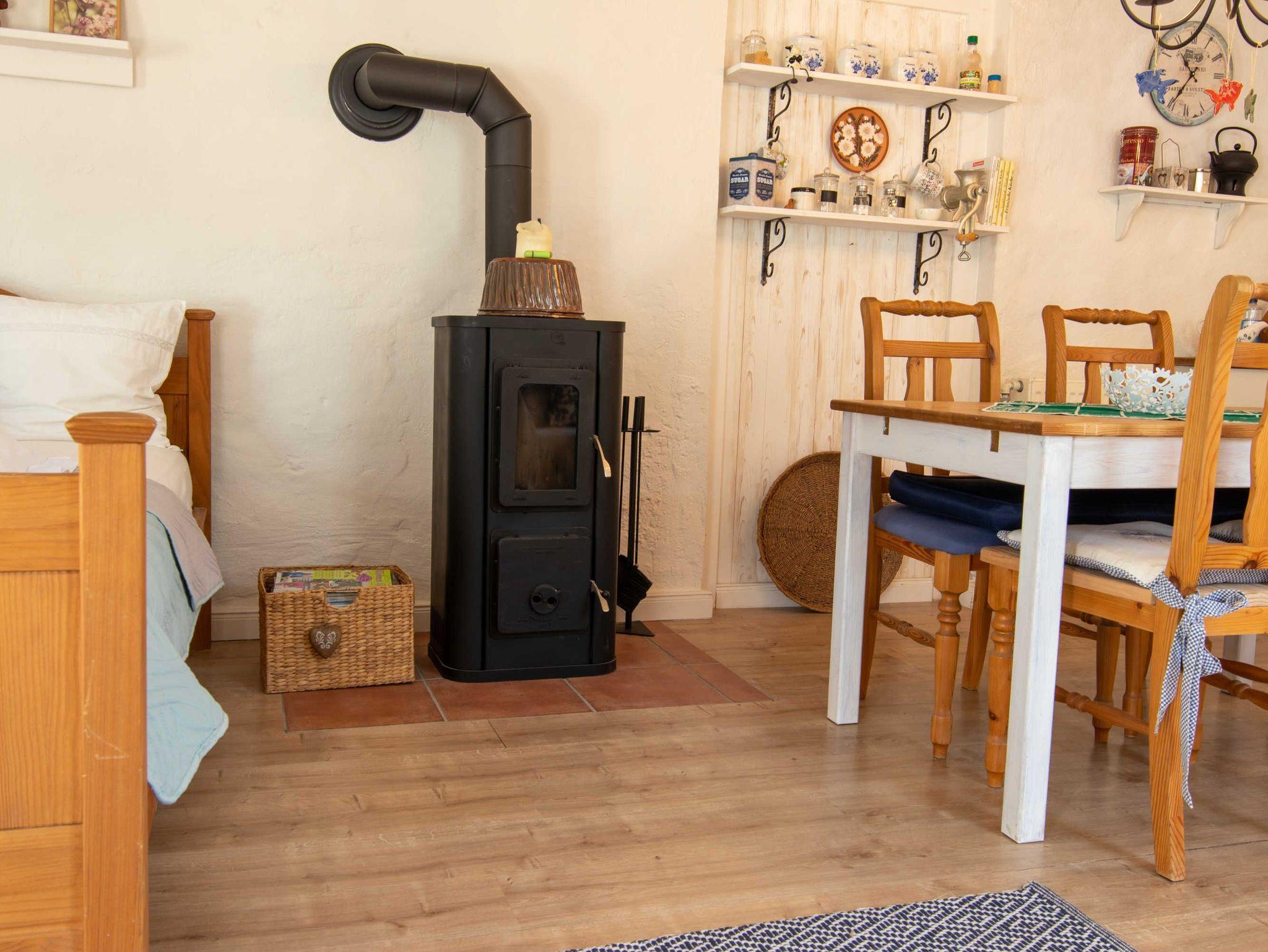 Der Wohn- und Schlafzimmerbereich ist mit einem Doppelbett (180x200) Kaminofen, TV und kleiner Sitzecke ausgestattet. Weiterhin befindet sich im Wohn- und Schlafraum eine integrierte Küche mit Kühlschrank mit Gefrierfach, Herd, Kaffeemaschine, Wasserkocher und Toaster sowie ein Essbereich. Das Badezimmer verfügt über eine Dusche und WC.