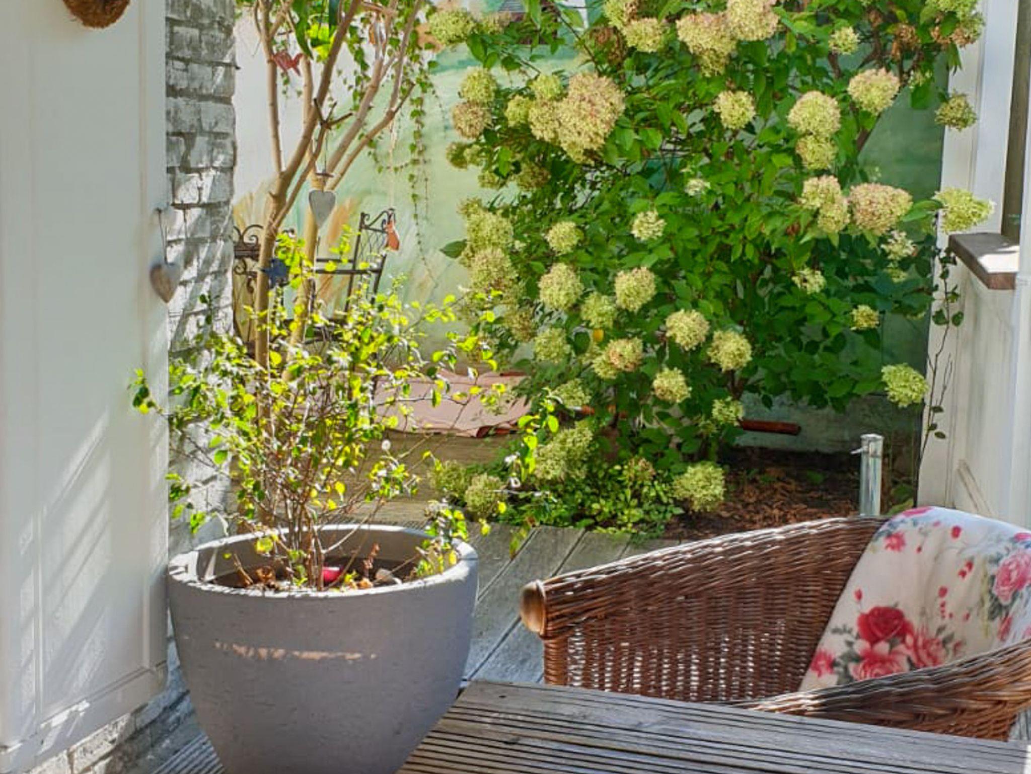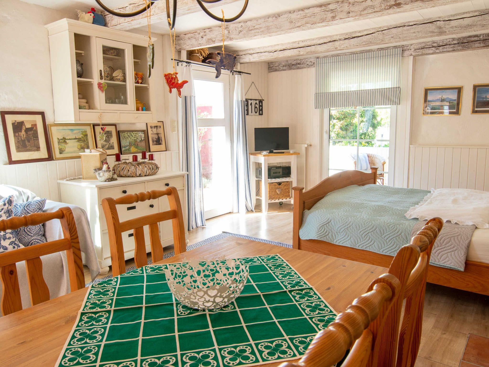 Das 36m² Appartement Uns Schün befindet sich auf dem Grundstück des Vermieters und bietet 2 Personen eine helle, gemütlich-romantische Unterkunft mit Blick ins Grüne.