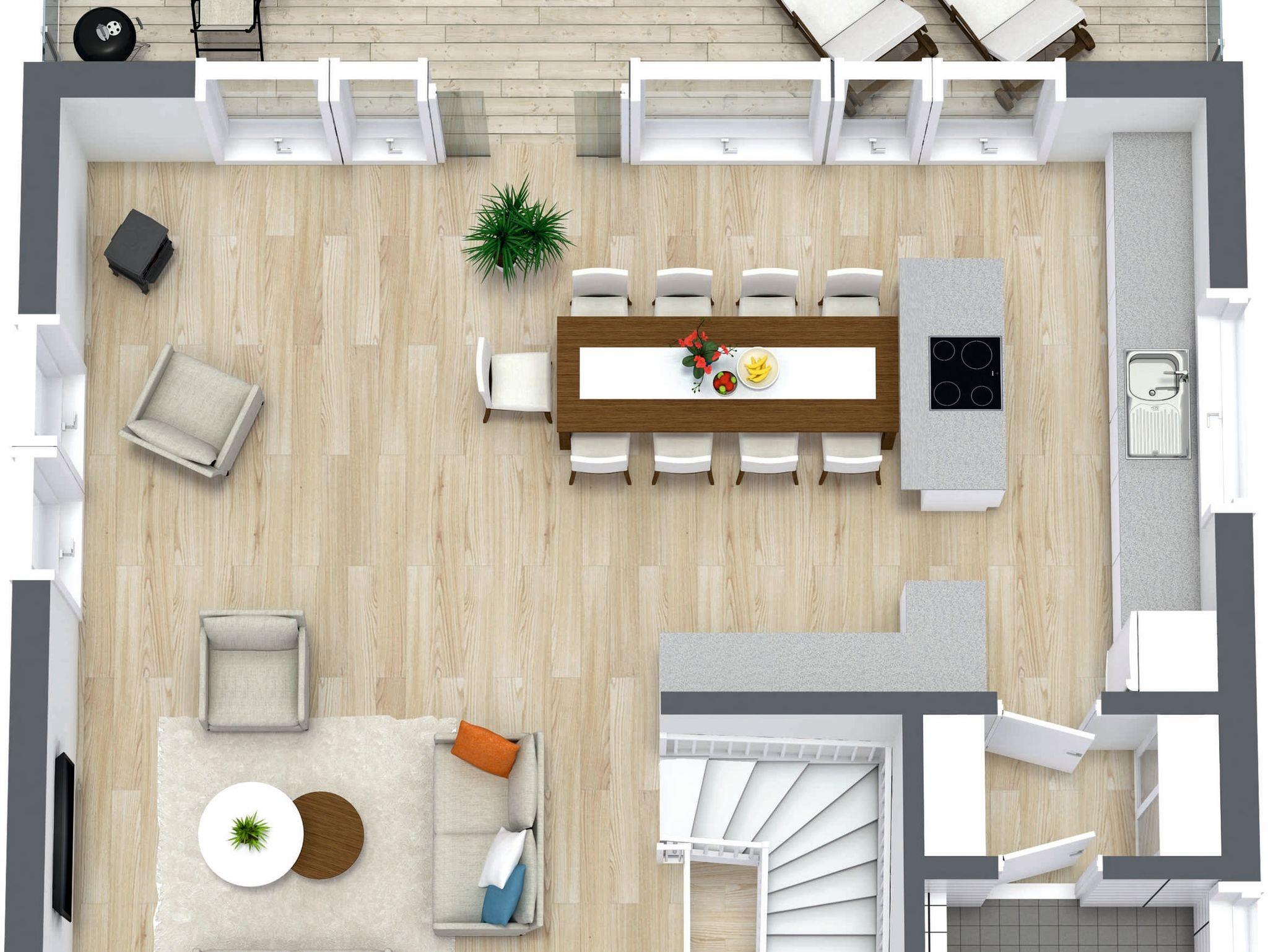 Der lichtdurchflutete Wohnbereich mit Zugang zur Sonnenterrasse, sowie der Küchenbereich und ein separates WC befinden sich in der oberen Etage.