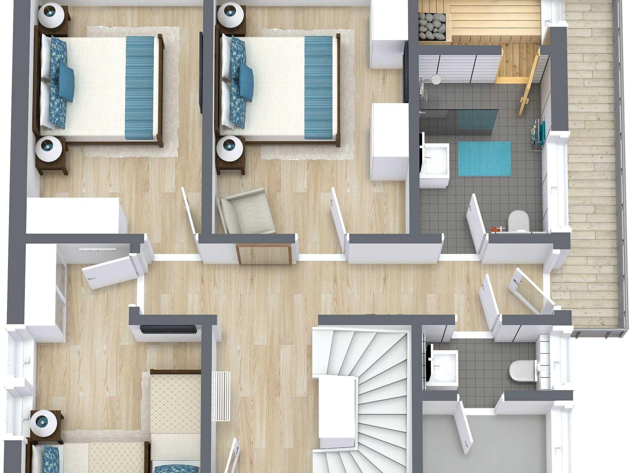 Neben den 3 separaten Schlafzimmern - 2 Schlafzimmer mit Doppelbett, 1 Schlafzimmer mit 2 Hochbetten - befinden sich außerdem ein Bad mit Dusche und Waschbecken, ein Bad mit WC und Waschbecken im unteren Deck.