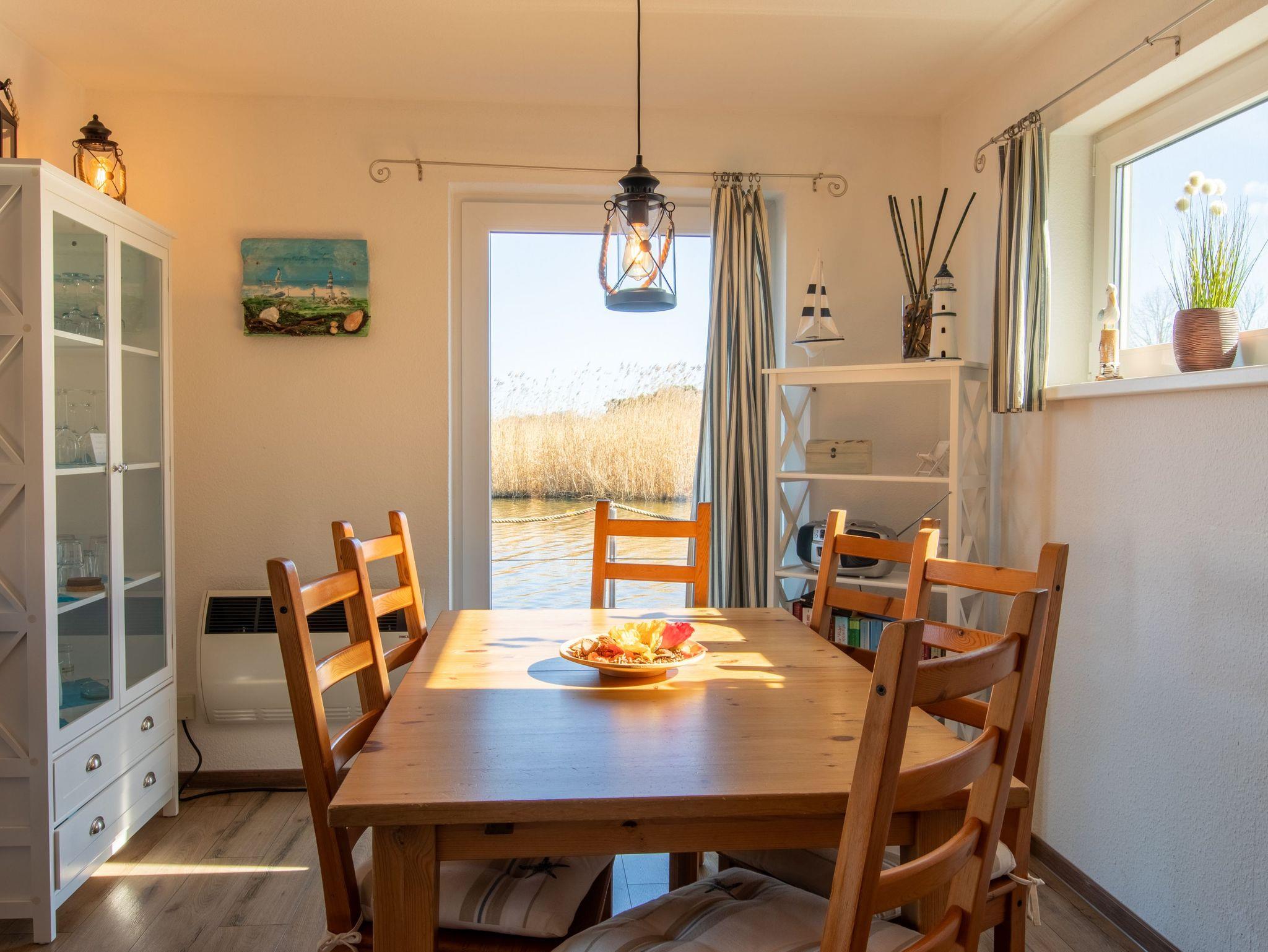 Floating House 5 in Kröslin ist der perfekte Ort für alle, die das Wasser lieben ? und es gern direkt vor der Tür haben. Mit 75 m² Wohnfläche auf zwei Etagen, Platz für bis zu 6 Personen und einem gut erzogenen Hund an deiner Seite, erlebst du hier echten Hausbooturlaub zwischen Natur, Hafenflair und maritimer Freiheit. Im Erdgeschoss empfängt dich ein offener, lichtdurchfluteter Wohnbereich, ausgestattet mit Sofa, Schwing-Sessel und Esstisch für sechs Personen. Große Fenster holen den Hafenblick direkt ins Wohnzimmer ? und machen das Ankommen ganz leicht. Die praktische Küche ist integriert und lässt keine Wünsche offen: Ceranfeld, Backofen mit Grill, Mikrowelle, Geschirrspüler, Kühlschrank, Kaffeemaschine, Toaster und mehr stehen bereit für kulinarische Urlaubsmomente. Oben geht?s gemütlich weiter: Zwei Schlafzimmer mit Doppelbett (180x200) bieten Privatsphäre, das dritte Zimmer mit Schlafcouch (140x200) eignet sich ideal für Kinder oder als kleiner Rückzugsort zum Spielen, Lesen oder Träumen. Von zwei Zimmern gelangst du direkt auf den Balkon, der mit Relax-Liegen zum Sonnen und Durchatmen einlädt. Das Badezimmer bietet Dusche, WC, Spiegelschrank und Kosmetikspiegel. Für Unterhaltung sorgen Sat-TV, CD-Radio und WLAN über das Hafennetz. Beheizt wird das Hausboot über Elektro-Heizkörper in jedem Raum ? ideal für kühlere Tage. Im Außenbereich laden dich zwei Highlights ein: die möblierte Terrasse am Bug, nur wenige Zentimeter über dem Wasser und der Balkon mit Weitblick über die Landschaft rund um den Peenestrom. Wer ein kleines Sportboot (bis 4,5m Länge) mitbringt, kann direkt am Haus anlegen. Die Marina Kröslin bietet dir alles, was das Urlaubsherz begehrt: Gastronomie, Sauna, Spa, Fahrrad- und Bootsverleih, Einkaufsmöglichkeiten und sogar eine kleine Fähre zur Insel Usedom ? perfekt für Tagesausflüge mit dem Rad.