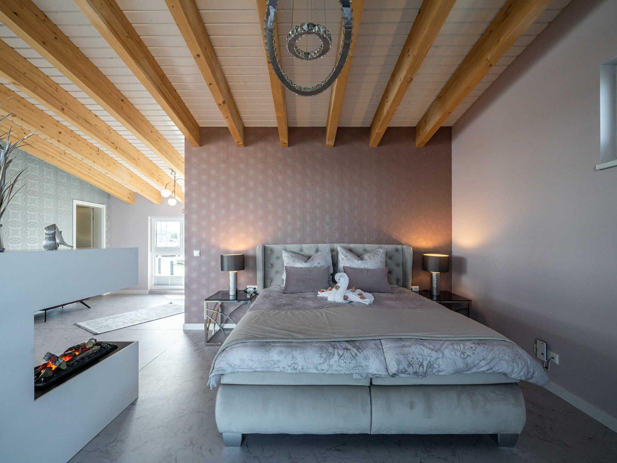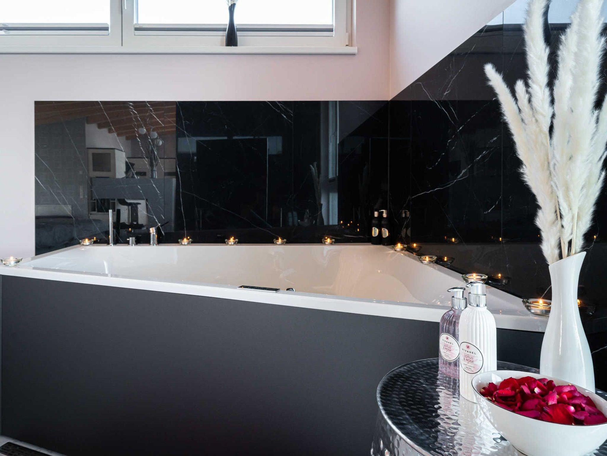 Ein freistehender Whirlpool, ein komfortables Boxspringbett, eine gemütliche Sitzecke mit Kamin und ein großzügiger Küchen- und Essbereich, alles in hochwertiger Optik mit Blick in den Hafen machen unsere Honeymoon-Suite einzigartig.