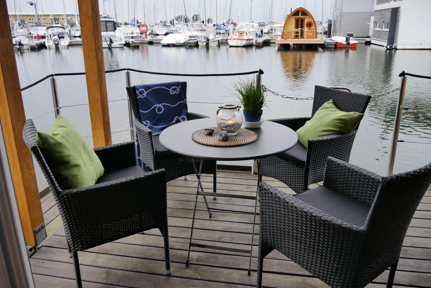 Im 1. Deck befindet sich das geräumige Wohnzimmer mit Essecke und Küchenzeile. Das Wohnzimmer ist modern-maritim eingerichtet mit einem Sofa und Schwing-Sessel mit Hocker-Kombination. Der Esstisch bietet Sitzgelegenheiten für bis zu 6 Personen, ein Kinderhochstuhl steht Ihnen kostenlos zur Verfügung.An das Wohnzimmer schließt sich eine Terrasse an, hier stehen 4 Gartenstühle und ein Tisch für Sie bereit.