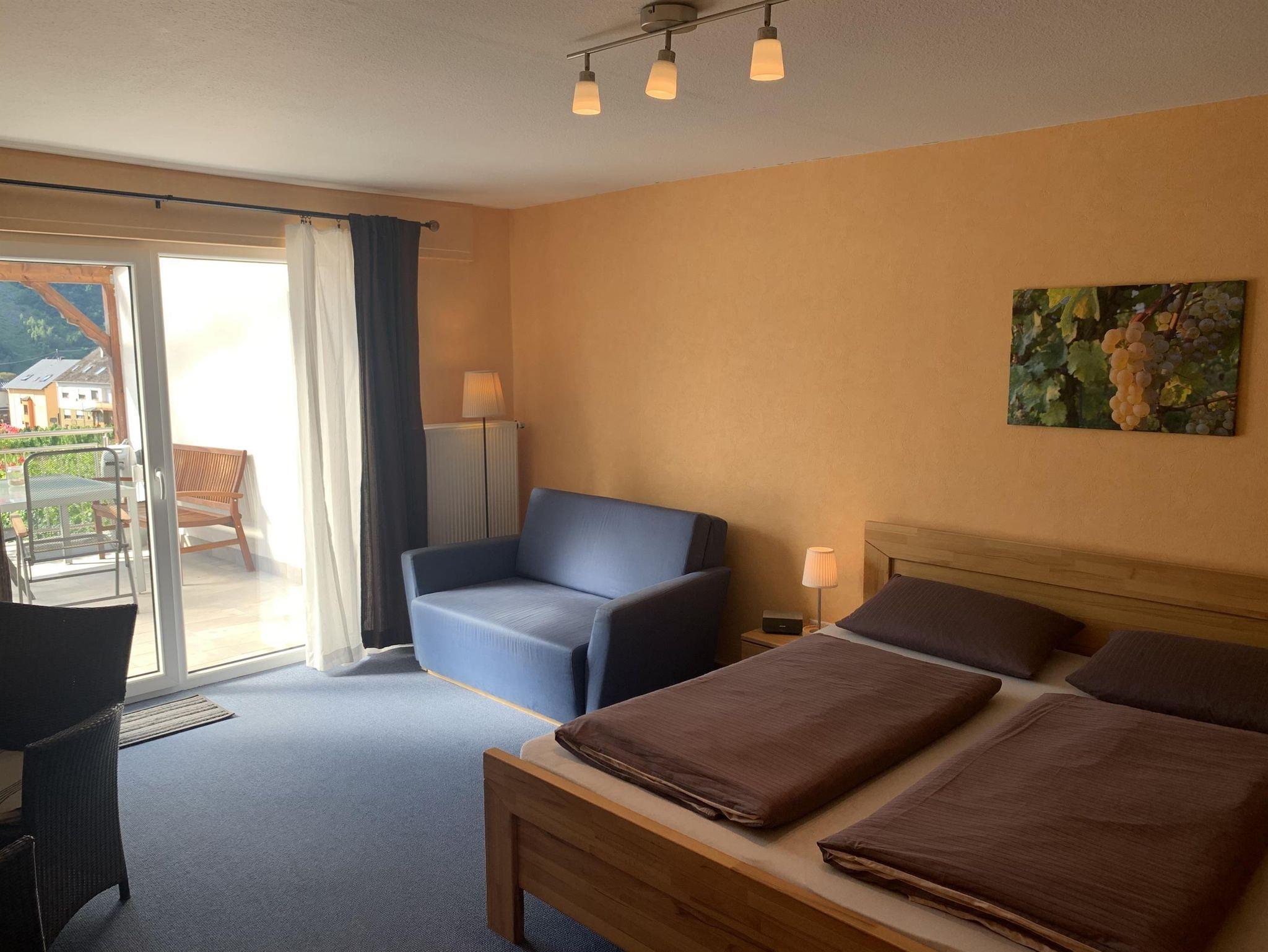 gemütliches Doppelzimmer mit eigenem Zugang zur Terasse, Flachbildschirm, Kühlschrank, Wasserkocher.