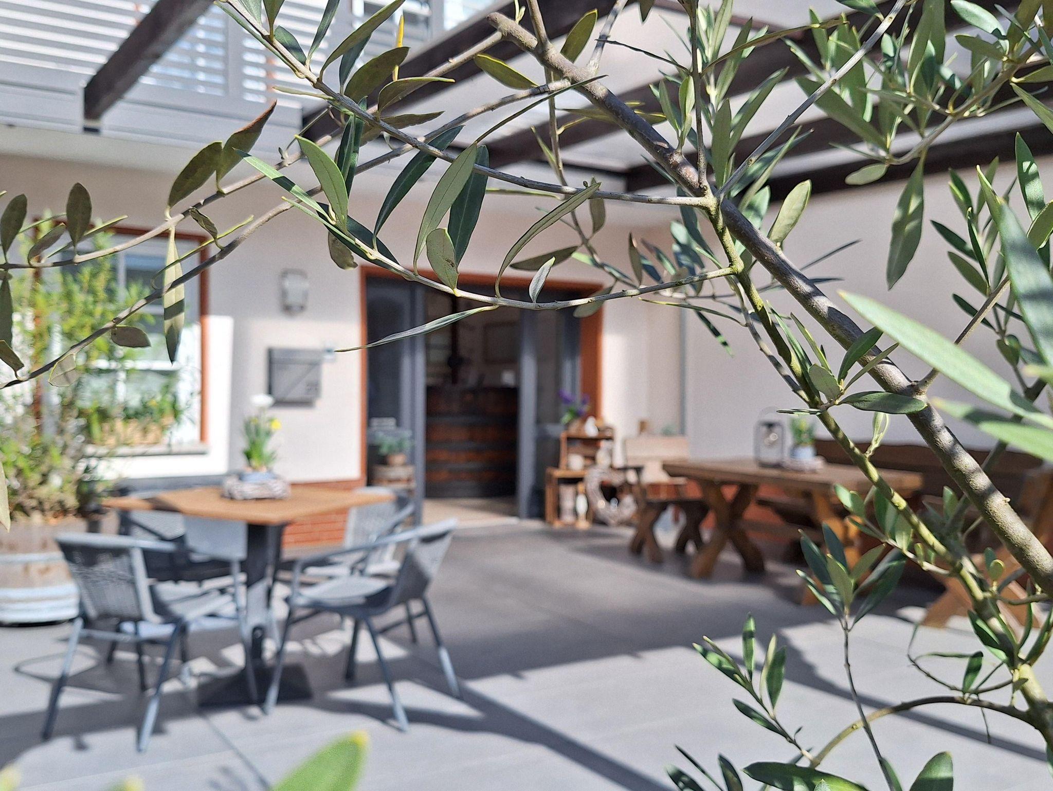 Überdachte Terrasse - ein grüne Oase unter Weinranken und mediterranen Pflanzen | Liegewiese mit Pavillon und Grillplatz | Parkplätze vor unserem Haus | Unterstellmöglichkeit für Ihre Fahrräder