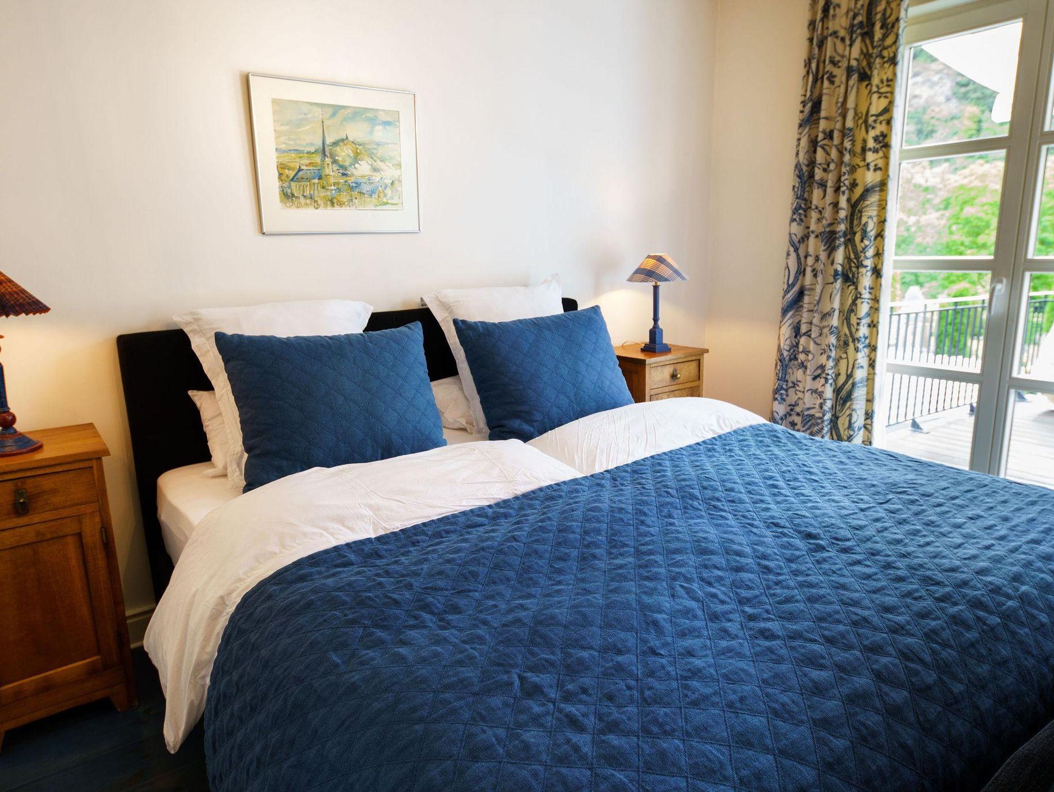 Zimmer im Landhausstil, französische Stoffe, Boxspringbett, DU/WC,Haartrockner, Kosmetikspiegel, Flachbild- TV, Minibar, Terrasse mit wunderschönen Blick auf Mosel und Garten, kostenfreies W-LAN, Verwöhn Frühstück vom Buffet