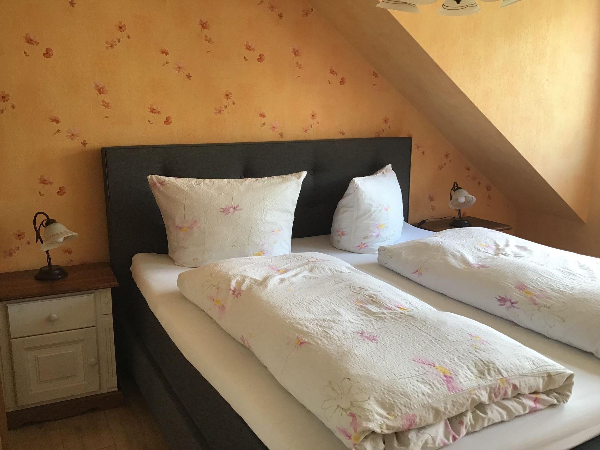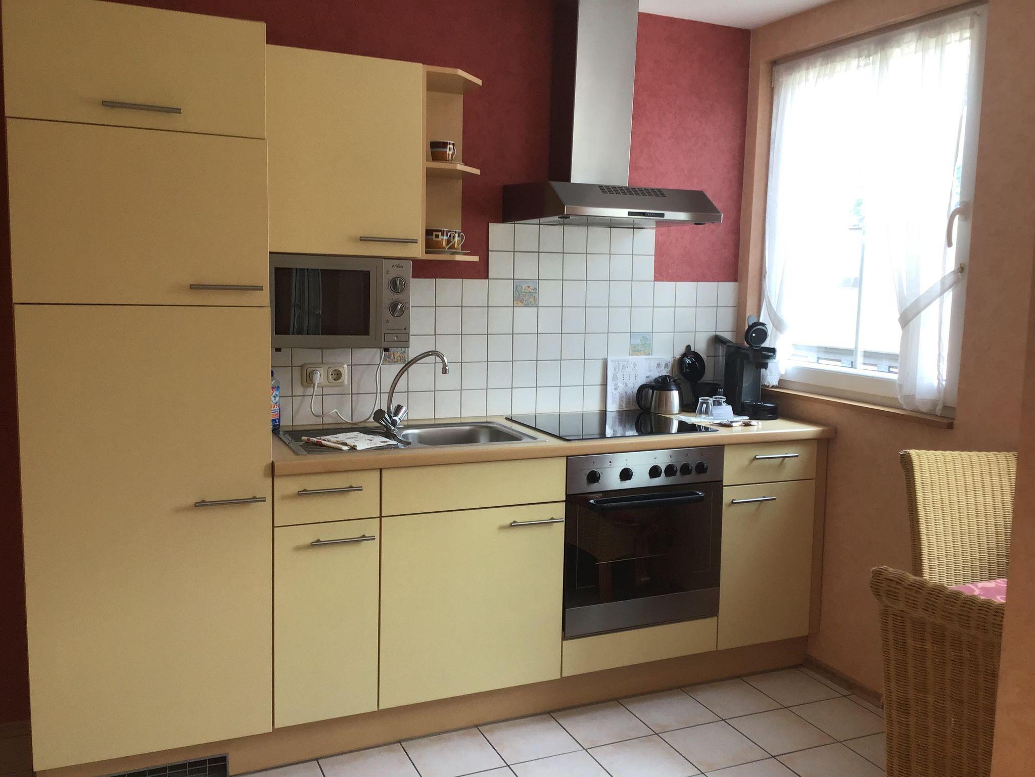 Die 40qm große Feriewohnung auf der 2 Etage hat eine eigene überdachte Terasse auf der sie bei Wind und Wetter die Moselduft genießen können. Im hellen Schlafzimmer befindet sich ein bequemes Boxspringbett. In der vollausgestatteten Küche mit Ceranfeld und Backofen, Mikrowelle und Kühlschrank mit Gefrierfach.