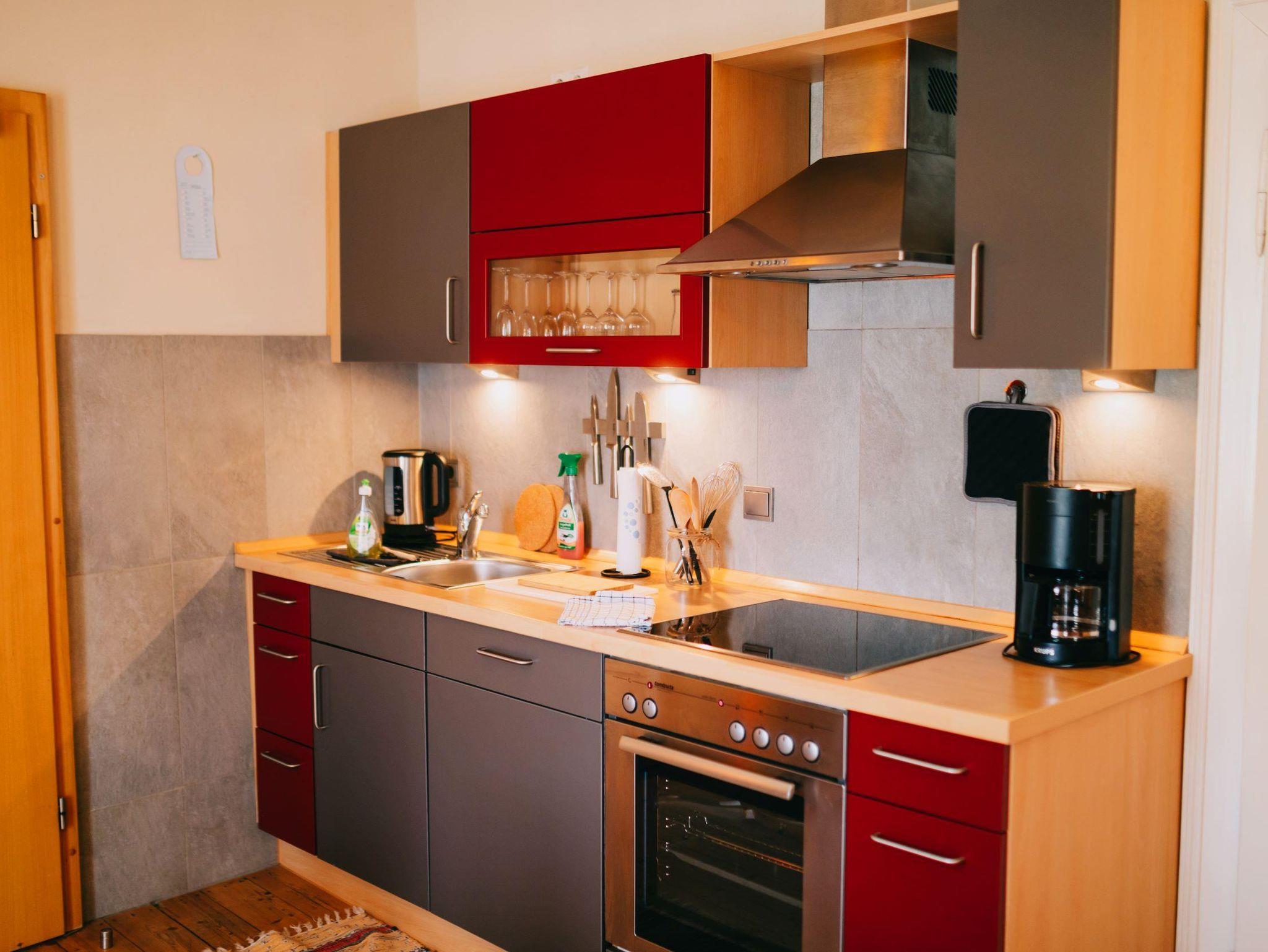 Diese moderne Wohnung mit 55m² hat ein großes Schlafzimmer mit Doppelbett und ein Badezimmer mit Badewanne und Dusche. Gleich bei dem geräumigen Wohnraum mit integrierter Küchenzeile (Spülmaschine, Ofen) befindet sich eine große Sonnenterrasse mit herrlichem Blick auf die Weinberge.