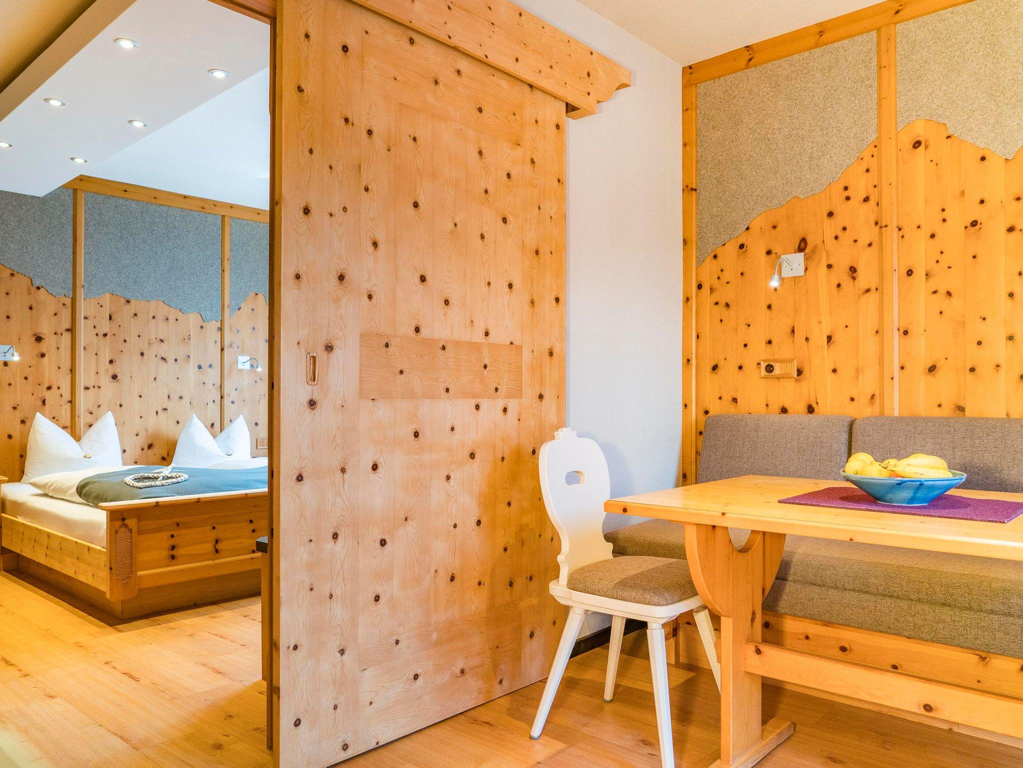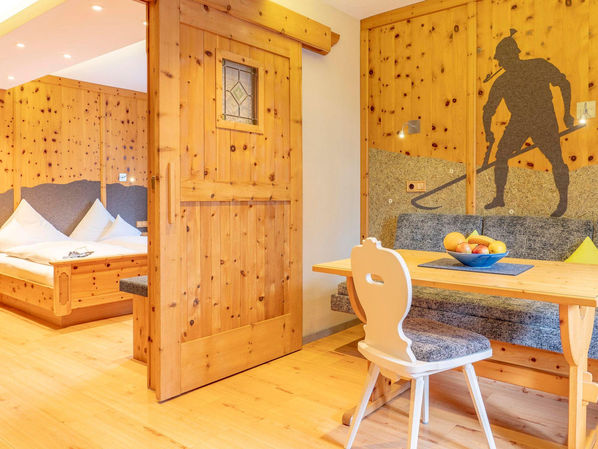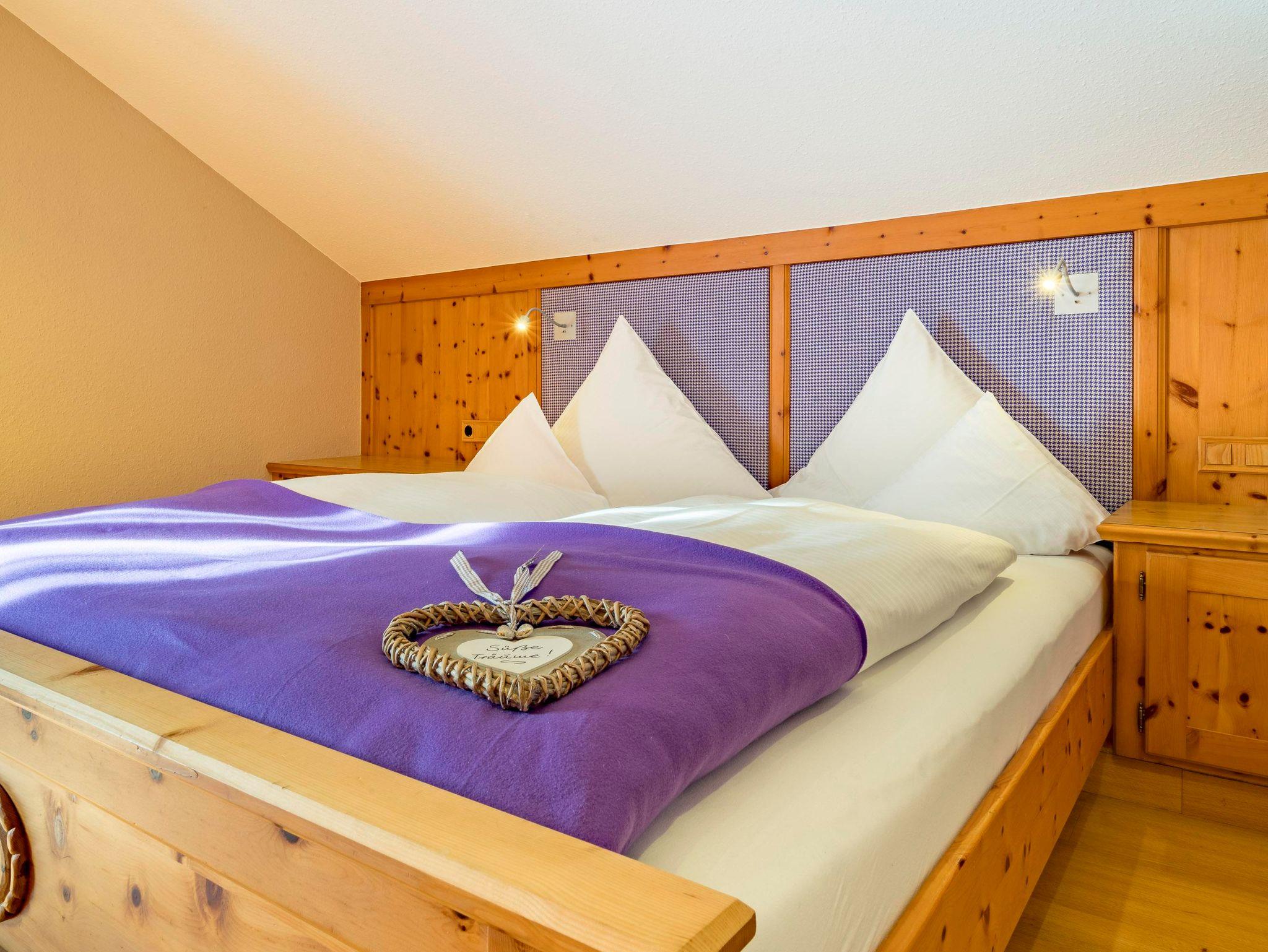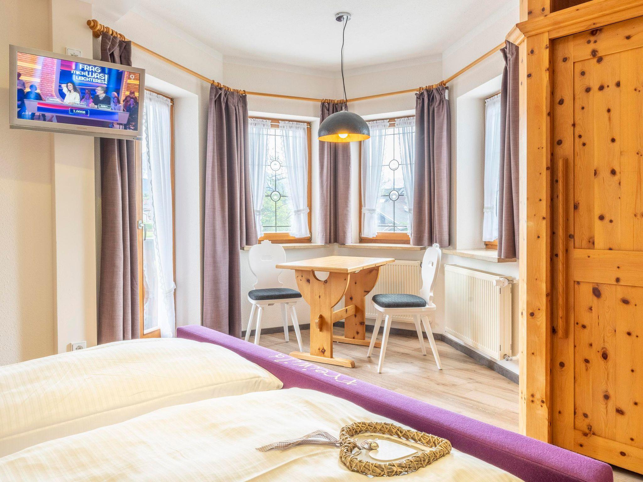 Ein echter Hingucker ist das gemütliche Lodenbett, das von einem beeindruckenden Hirschmotiv „bewacht“ wird – kraftvoll, ruhig und stimmungsvoll zugleich. Im romantischen Erker des Schlafzimmers lädt eine kleine Sitzecke mit Tisch und zwei Stühlen zum Lesen, Schreiben oder einfach zum Verweilen mit Bergblick ein. Für entspannte Abende steht Ihnen hier auch ein eigener Smart-TV zur Verfügung.