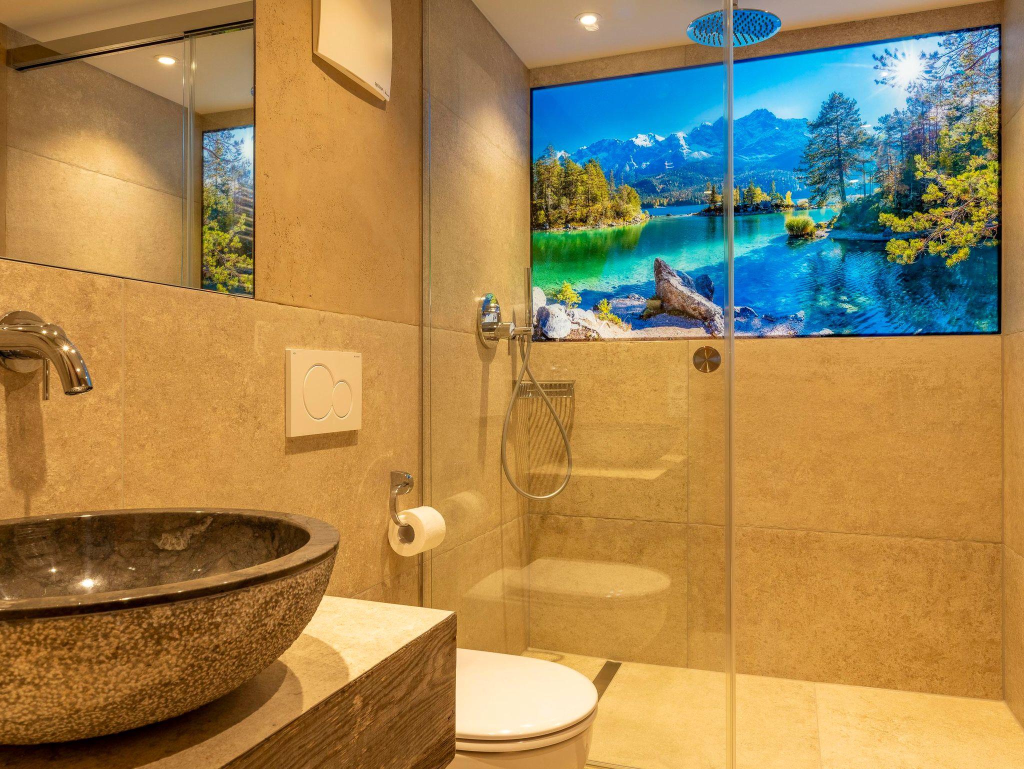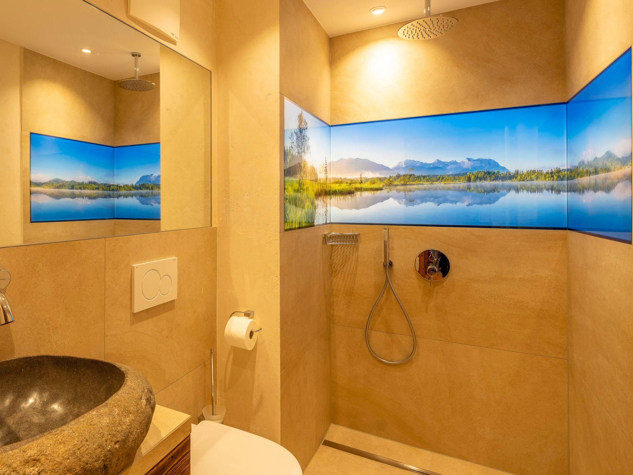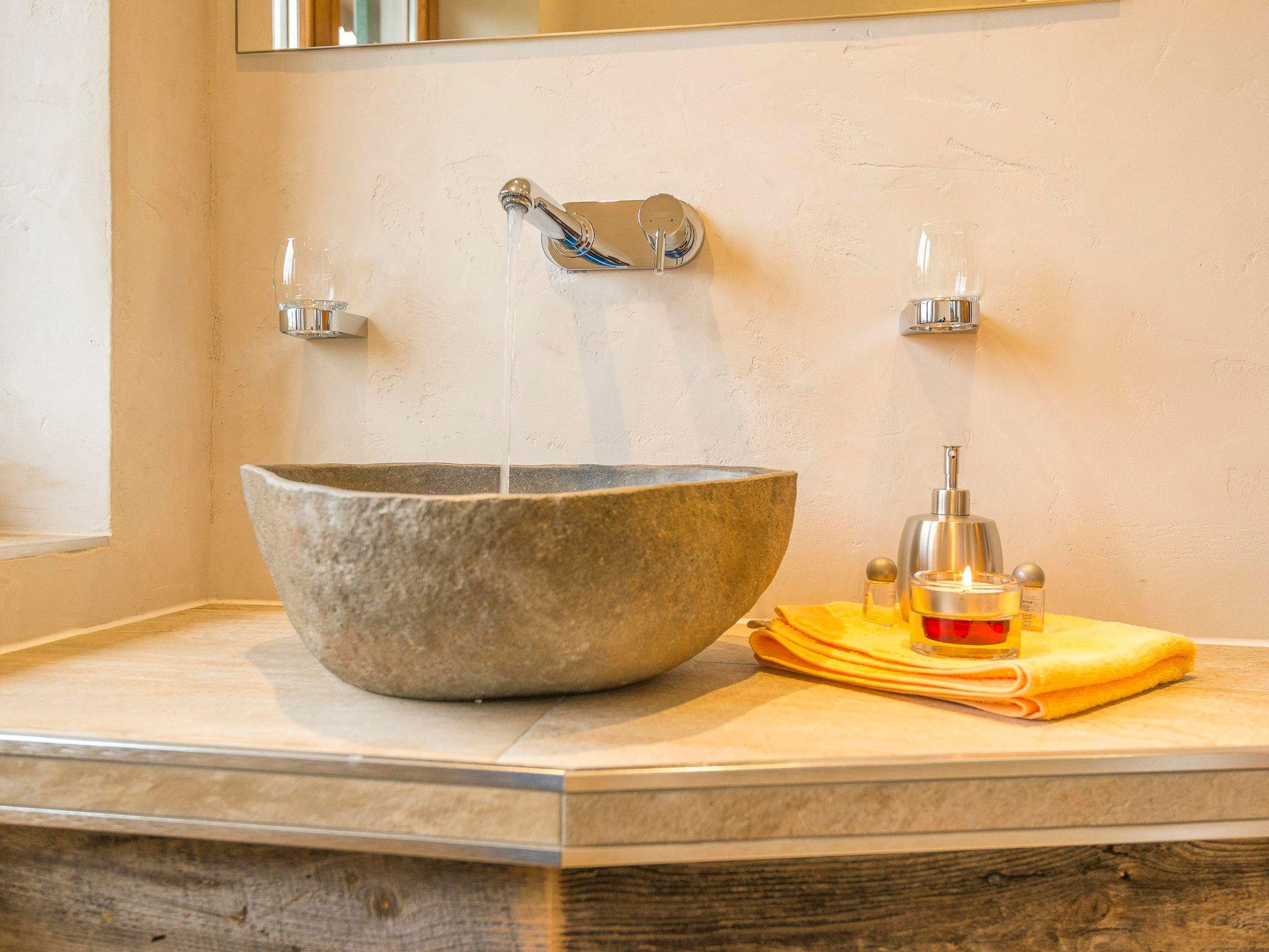 Im stilvollen Badezimmer erwarten Sie ein edles Granitstein-Waschbecken und eine großzügige Regendusche – ein kleines Spa-Erlebnis nach einem aktiven Tag in der Natur.