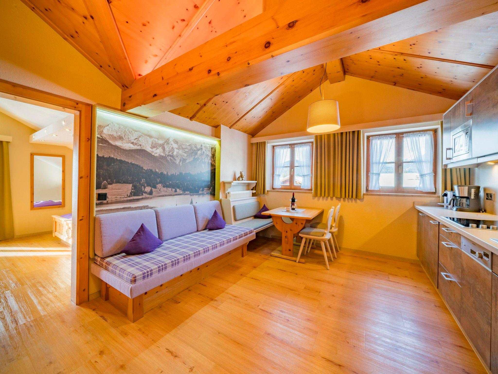 Besonders außergewöhnlich: Zwei Balkone mit grandioser Aussicht. Vom Südbalkon blicken Sie auf das Soiern- und Karwendelgebirge, vom Westbalkon genießen Sie den Sonnenuntergang über dem Wetterstein- und Estergebirge. So können Sie die Sonne den ganzen Tag begleiten – vom Morgenkaffee bis zum Abendglas Wein.