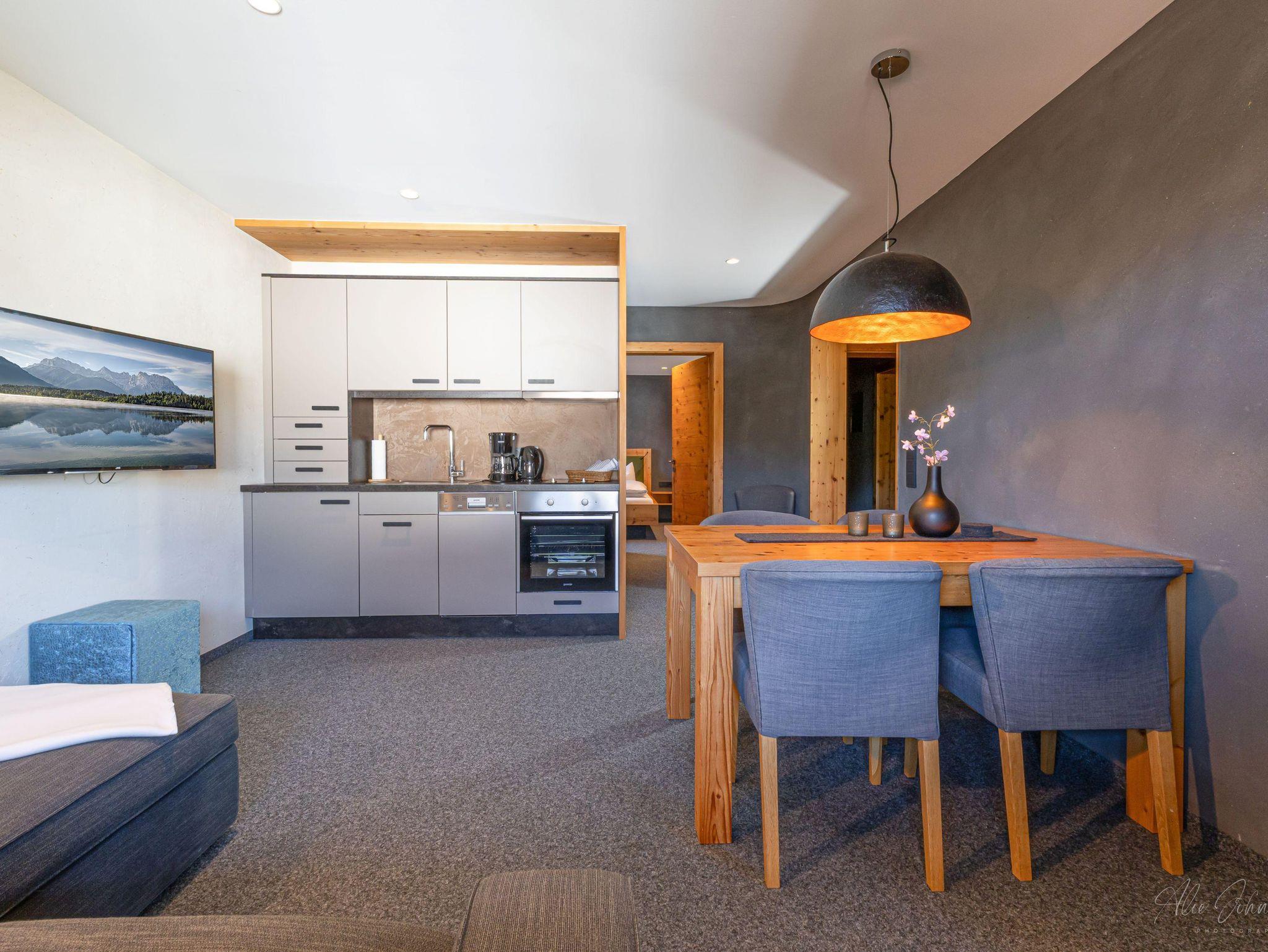 Gemütliches Apartment im exklusiven Design mit zwei separaten Schlafzimmern mit Doppelbetten und TV. Zusatzzimmer „Unterschlupf“ mit Doppelbett, Waschbecken und TV. Wohnraum mit moderner Küchenzeile, Esstisch mit Stühlen, Smart-TV und Couch/Schlafcouch. Zwei Badezimmer mit Fußbodenheizung und ebenerdigen Duschen mit Rainshower. Wellnessbereich mit Sauna und Massageangebot für Frauen, Waschmaschine, Trockner, Leihräder und Gemeinschaftraum.