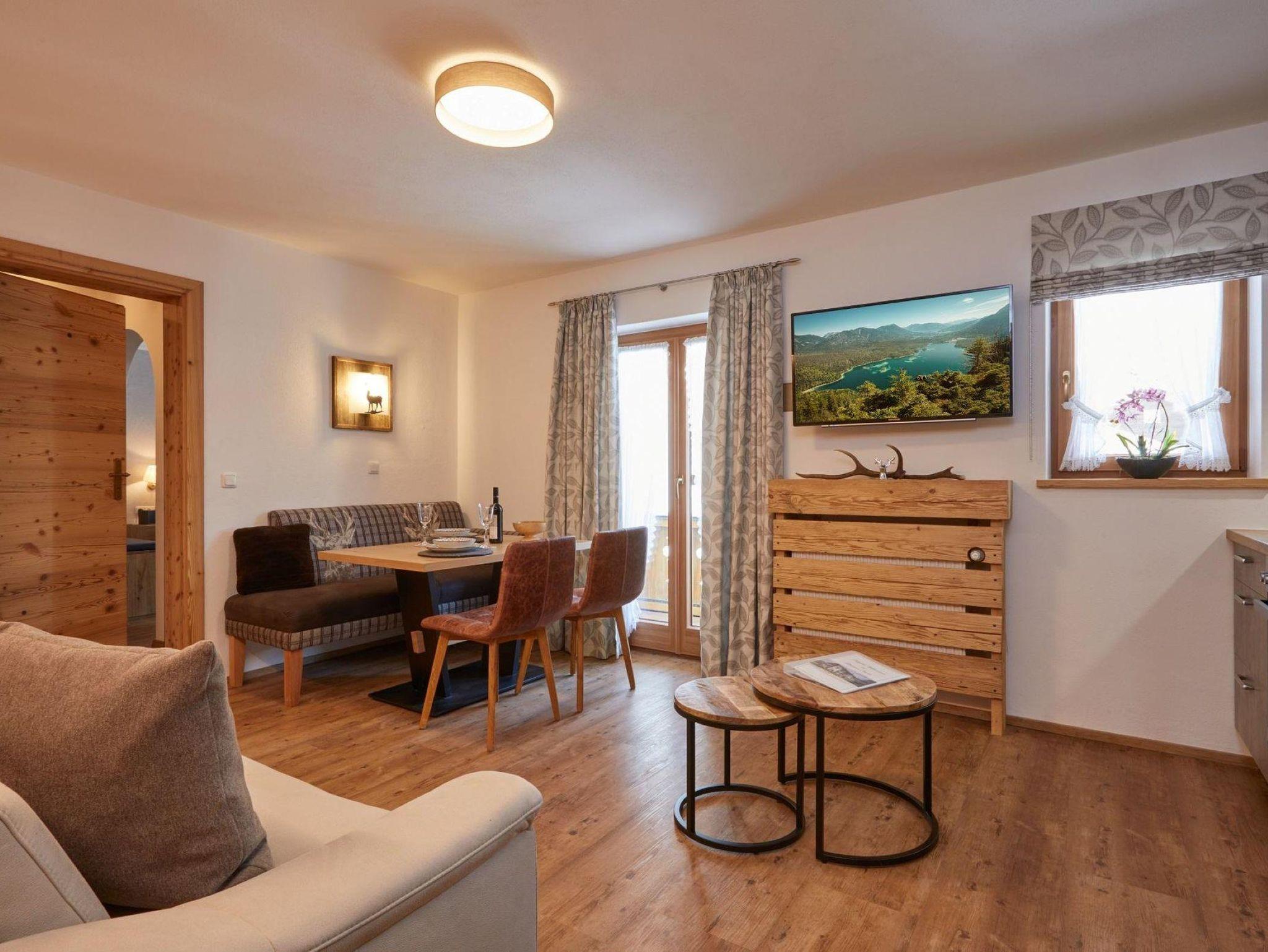 Hochwertige Ausstattung, Wohnung im 1. Stock mit möblierten Ostbalkon, ca. 47 qm mit Blick auf das Karwendelgebirge